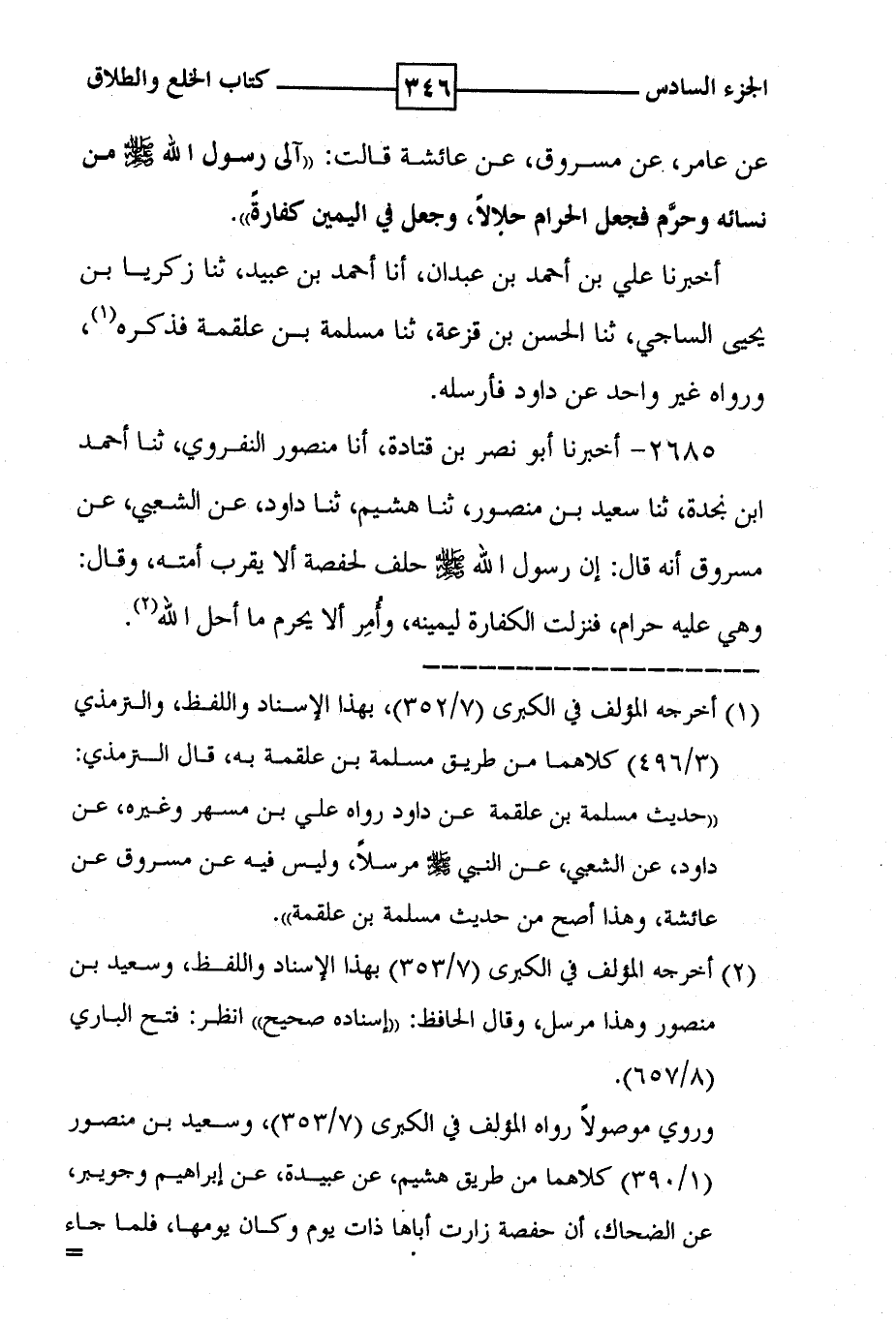 عن عامر ، عن مسروق ، عن عائشة قالت : ' آلى رسول الله صلى الله عليه وسلم من نسائه وحرم فجعل الحرام حلالا ، وجعل في اليمين كفارة ' . أخبرنا علي بن أحمد بن عبدان ، أنا أحمد بن عبيد ، ثنا زكريا بن يحيى الساجي ، ثنا الحسن بن قزعة ، ثنا مسلمة بن علقمة فذكره ( 1 ) ، ورواه غير واحد عن داود فأرسله . 2685 - أخبرنا أبو نصر بن قتادة ، أنا منصور النفروي ، ثنا أحمد ابن نجدة ، ثنا سعيد بن منصور ، ثنا هشيم ، ثنا داود ، عن الشعبي ، عن مسروق انه قال : إن رسول الله صلى الله عليه وسلم حلف لحفصة ألا يقرب امته ، وقال : وهي عليه حرام ، فنزلت الكفارة ليمينه ، وأمر ألا يحرم ما احل الله ( 2 ) .