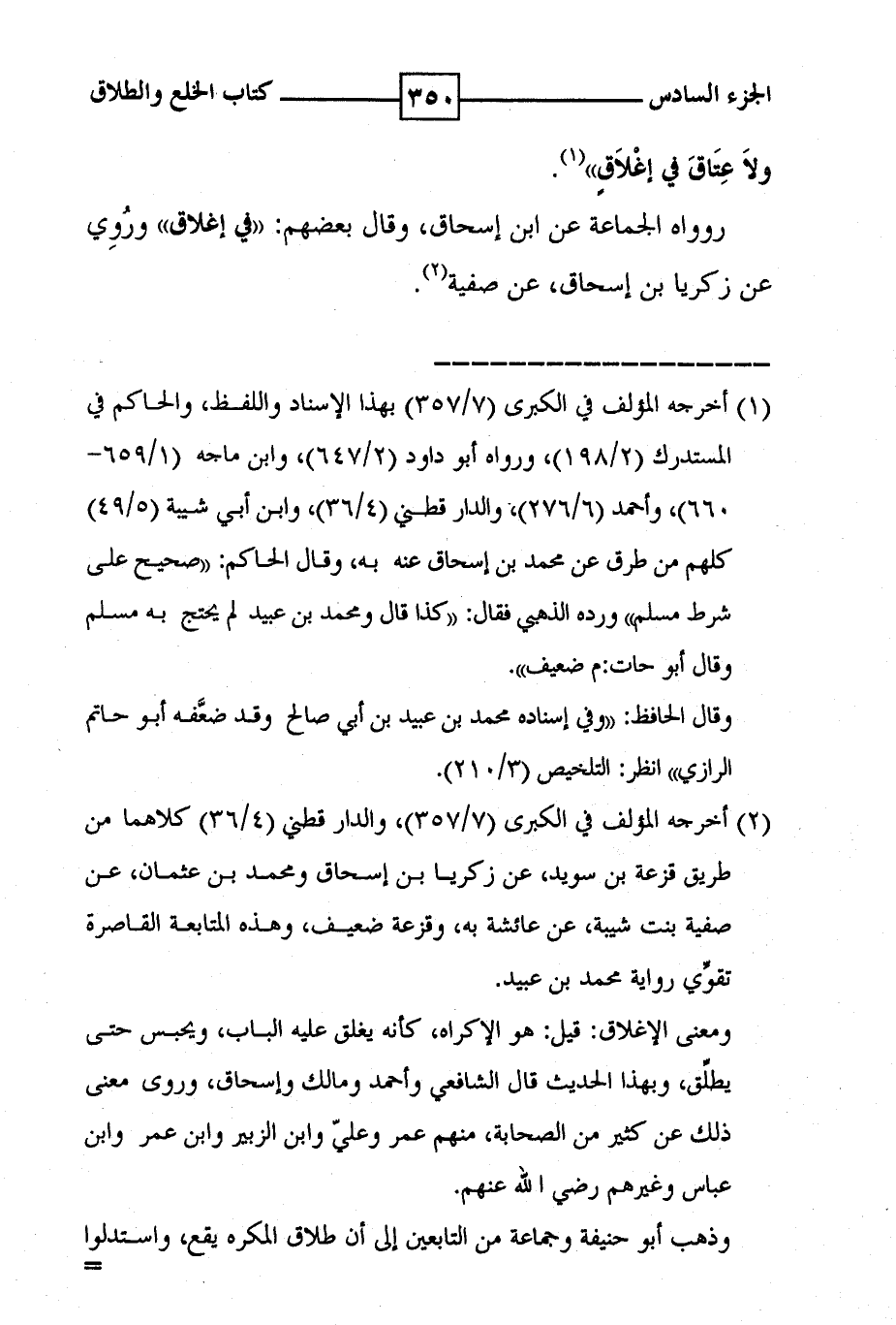 ولا عتاق في إغلاق ' ( 1 ) . روواه الجماعة عن ابن اسحاق ، وقال بعضهم : ' في اغلاق ' وروي عن زكريا بن اسحاق ، عن صفية ( 2 ) .