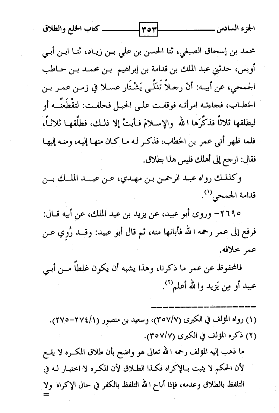 محمد بن إسحاق الصبغي ، ثنا الحسن بن علي بن زياد ، ثنا ابن أبي اويس ، حدثني عبد الملك بن قدامة بن إبراهيم بن محمد بن حاطب الجمحي ، عن أبيه : أن رجلا تدلى يشتار عسلا في زمن عمر بن الخطاب ، فجاءته امرأته فوقفت على الحبل فحلفت : لتقطعنه أو ليطلقها ثلاثا فذكرها الله والإسلام فأبت إلا ذلك ، فطلقها ثلاثا ، فلما ظهر اتى عمر بن الخطاب ، فذكر له ما كان منها إليه ، ومنه إليها فقال : ارجع إلى اهلك فليس هذا بطلاق . وكذلك رواه عبد الرحمن بن مهدي ، عن عبد الملك بن قدامة الجمحي ( 1 ) .