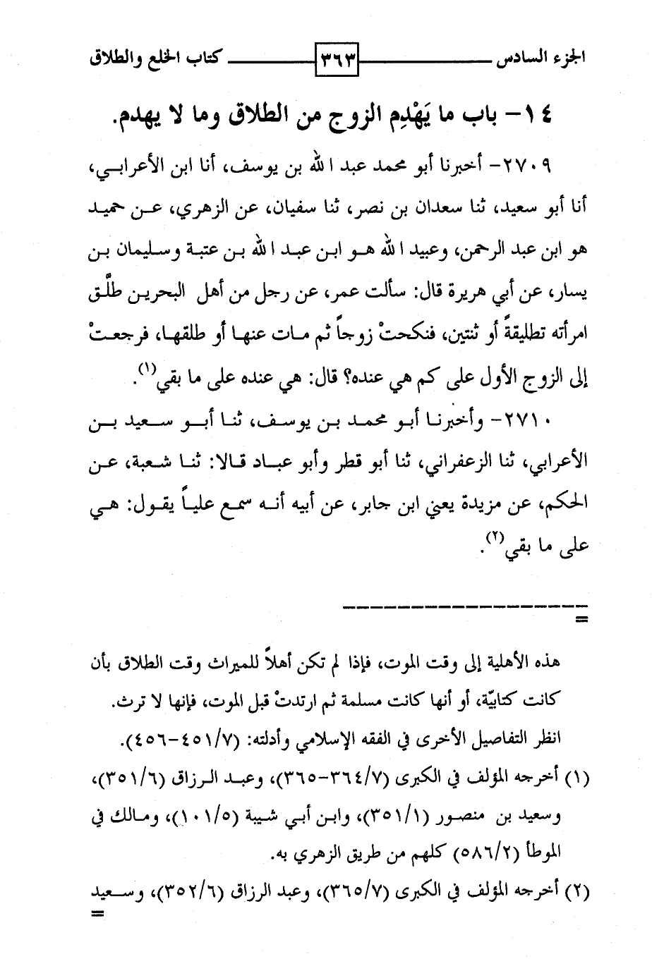 14 - باب ما يهدم الزوج من الطلاق وما لا يهدم 2709 - أخبرنا أبو محمد عبد الله بن يوسف ، أنا ابن الاعرابي ، أنا أبو سعيد ، ثنا سعدان بن نصر ، ثنا سفيان ، عن الزهري ، عن حميد هو ابن عبد الرحمن ، وعبيد الله هو ابن عبد الله بن عتبة وسليمان بن يسار ، عن أبي هريرة قال : سألت عمر ، عن رجل من أهل البحرين طلق امرأته تطليقة أو ثنتين ، فنكحت زوجا ثم مات عنها أو طلقها ، فرجعت إلى الزوج الأول على كم هي عنده ؟ قال : هي عنده على ما بقي ( 1 ) .