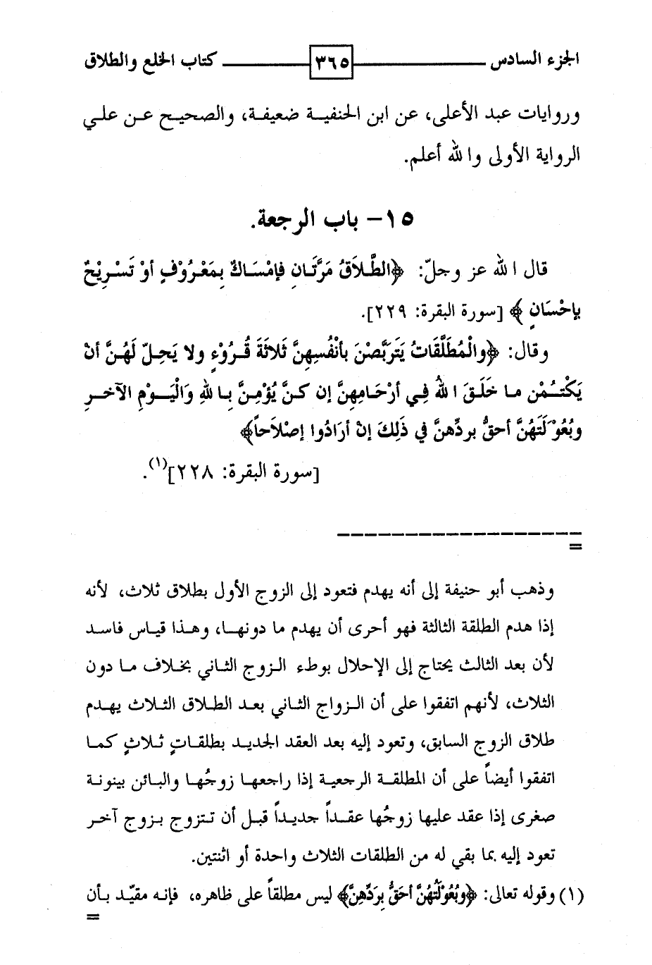 وروايات عبد الاعلى ، عن ابن الحنفية ضعيفة ، والصحيح عن علي الرواية الأولى والله أعلم . 15 - باب الرجعة قال الله عز وجل : ! ( الطلاق مرتان فإمساك بمعروف أو تسريح بإحسان ) ! [ سورة البقرة : 229 ] . وقال : ! ( والمطلقات يتربصن بأنفسهن ثلاثة قروء ولا يحل لهن أن يكتمن ما خلق الله في أرحامهن إن كن يؤمن بالله واليوم الآخر وبعولتهن أحق بردهن في ذلك إن أرادوا إصلاحا ) ! [ سورة البقرة : 288 ] ( 1 )
