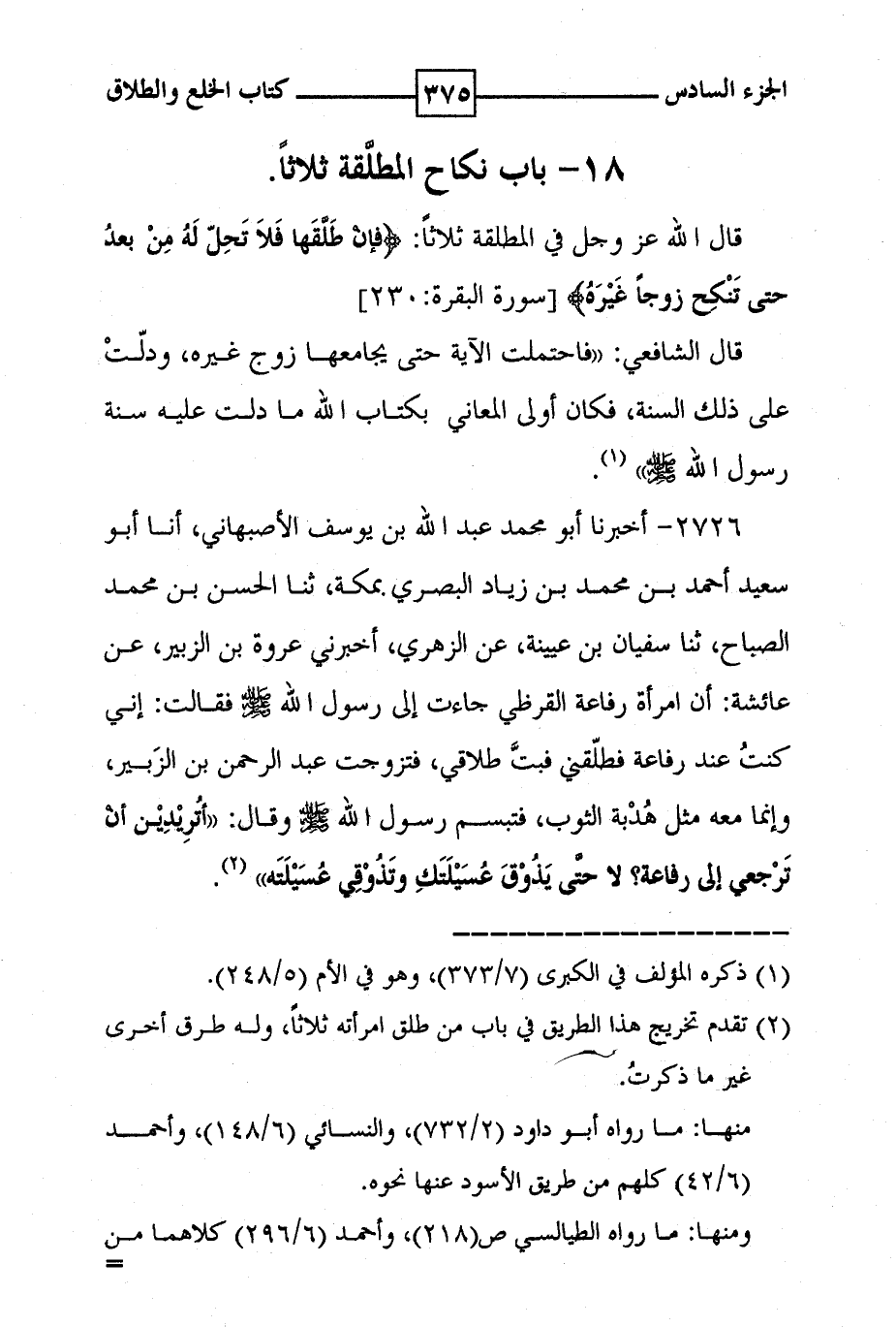 18 - باب نكاح المطلقة ثلاثا قال الله عز وجل في المطلقة ثلاثا : ! ( فإن طلقها فلا تحل له من بعد حتى تنكح زوجا غيره ) ! [ سورة البقرة : 230 ] . قال الشافعي : ' فاحتملت الآية حتى يجامعها زوج غيره ، ودلت على ذلك السنة ، فكان أولى المعاني بكتاب الله ما دلت عليه سنة رسول الله صلى الله عليه وسلم ' ( 1 ) .