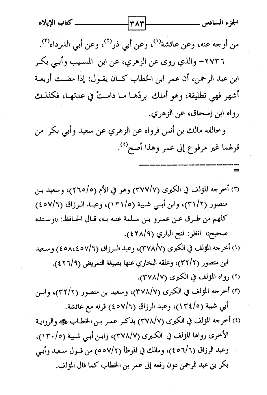 2736 - والذي روى عن الزهري ، عن ابن المسيب وأبي بكر ابن عبد الرحمن ، أن عمر ابن الخطاب كان يقول : إذا مضت أربعة اشهر فهي تطليقة ، وهو املك بردها ما دامت في عدتها ، فكذلك رواه ابن إسحاق ، عن الزهري . وخالفه مالك بن أنس فرواه عن الزهري عن سعيد وأبي بكر من قولهما غير مرفوع إلى عمر وهذا أصح ( 4 ) .