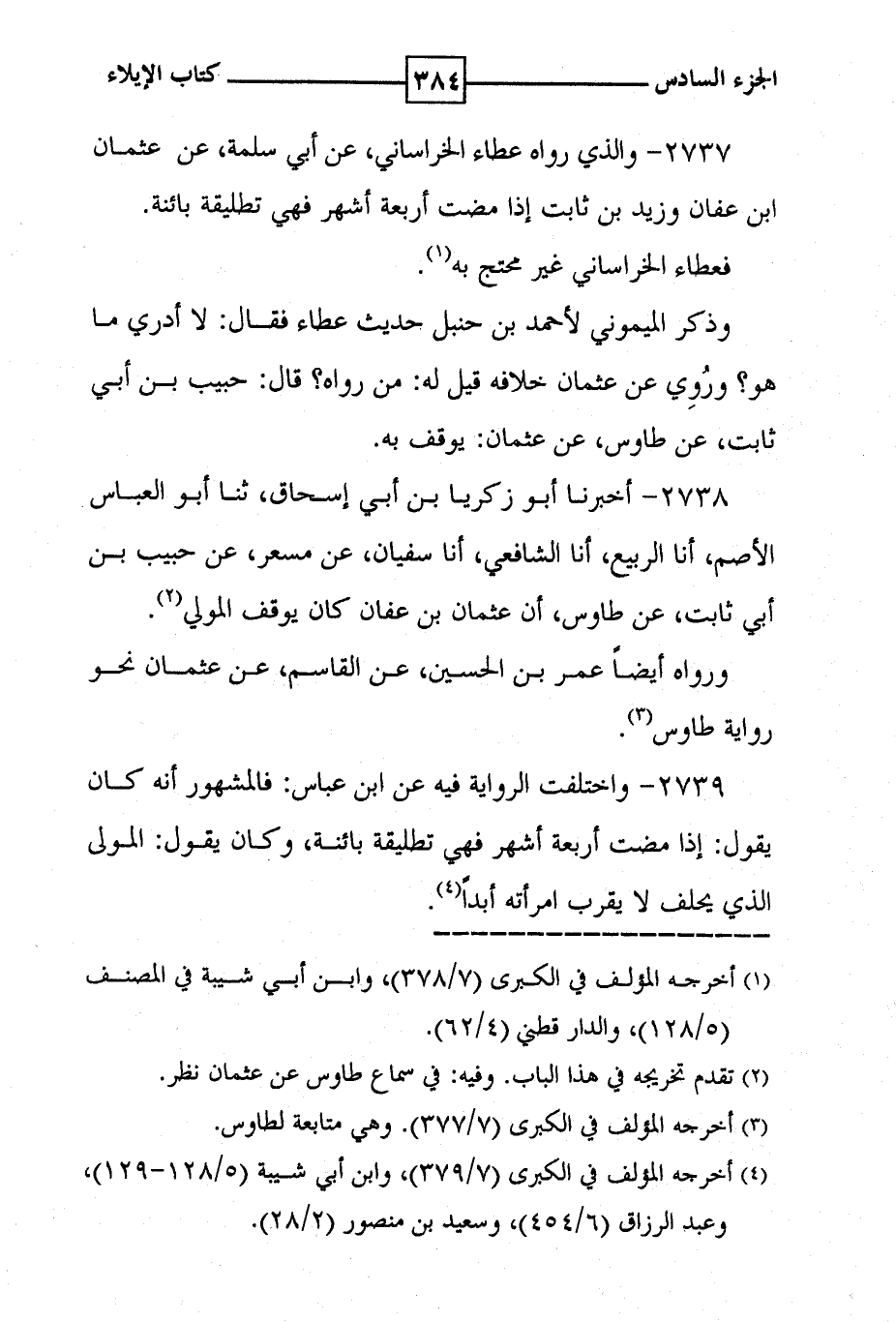2738 - أخبرنا أبو زكريا بن أبي إسحاق ، ثنا أبو العباس الاصم ، أنا الربيع ، أنا الشافعي ، أن سفيان ، عن مسعر ، عن حبيب بن أبي ثابت ، عن طاوس ، أن عثمان بن عفان كان يوقف المولي ( 2 ) . ورواه أيضا عمر بن الحسين ، عن القاسم ، عن عثمان نحو رواية طاوس ( 3 ) .