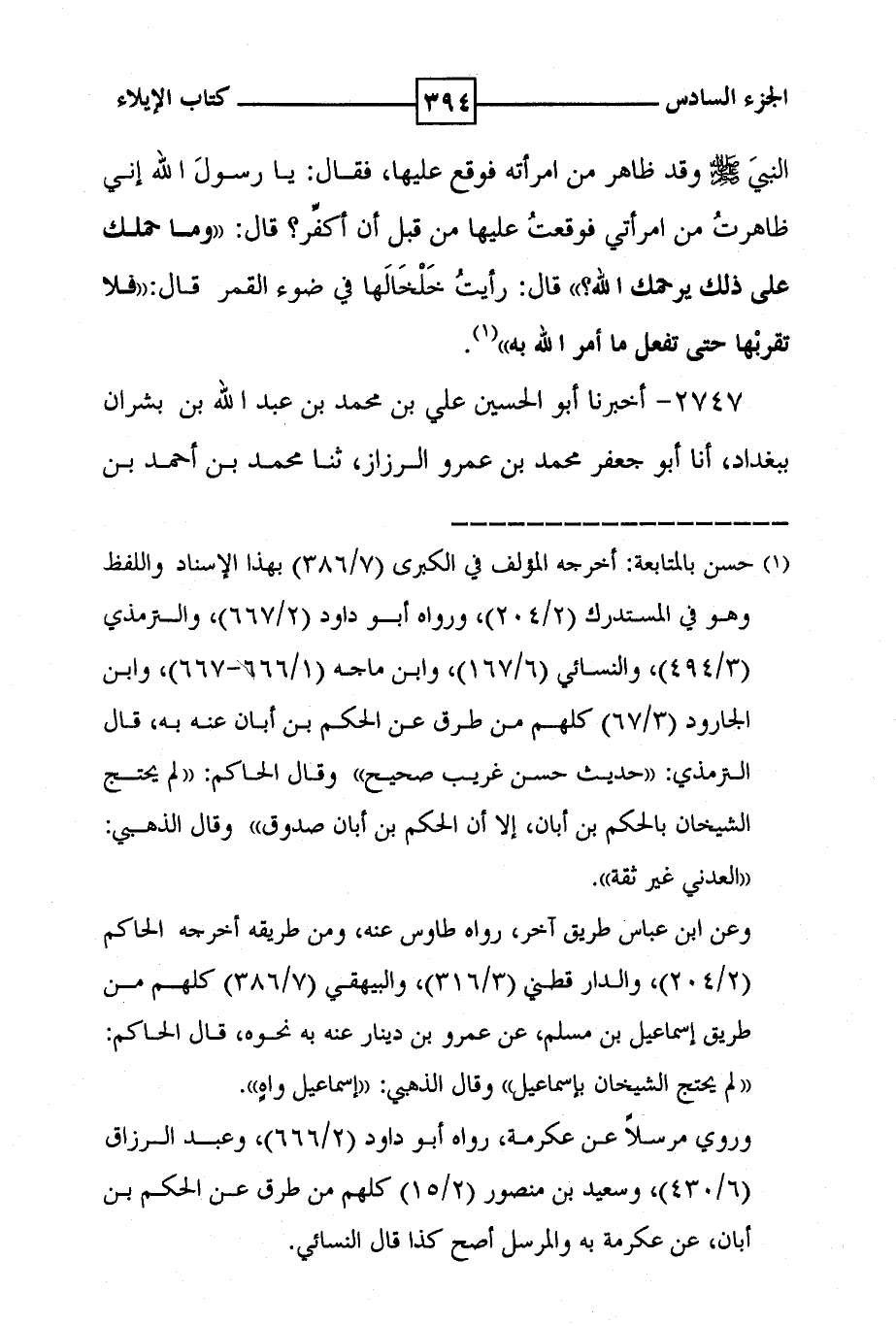 النبي صلى الله عليه وسلم وقد ظاهر من امرأته فوقع عليها ، فقال : يا رسول الله إني ظاهرت من امرأتي فوقعت عليها من قبل أن اكفر ؟ قال : ' وما حملك على ذلك يرحمك الله ؟ ' قال : رأيت خلخالها في ضوء القمر قال : ' فلا تقربها حتى تفعل ما أمر الله به ' ( 1 ) .