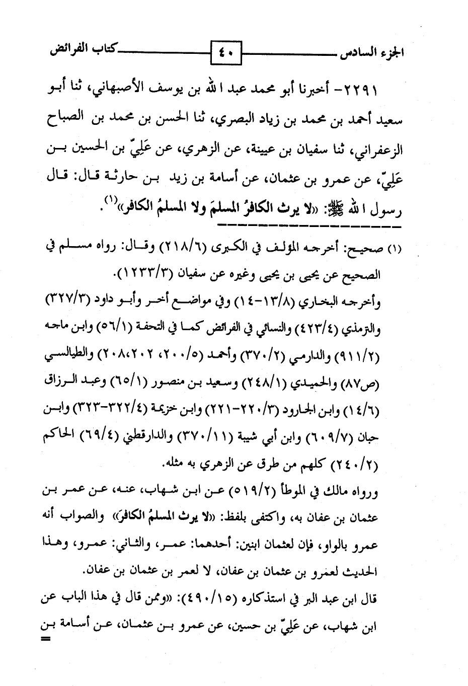 2291 - أخبرنا أبو محمد عبد الله بن يوسف الاصبهاني ، ثنا أبو سعيد أحمد بن محمد بن زياد البصري ، ثنا الحسن بن محمد بن الصباح الزعفراني ، ثنا سفيان بن عيينة ، عن الزهري ، عن علي بن الحسين بن علي ، عن عمرو بن عثمان ، عن أسامة بن زيد بن حارثة رسول الله صلى الله عليه وسلم : ' لا يرث الكافر المسلم ولا المسلم الكافر ' ( 1 ) .