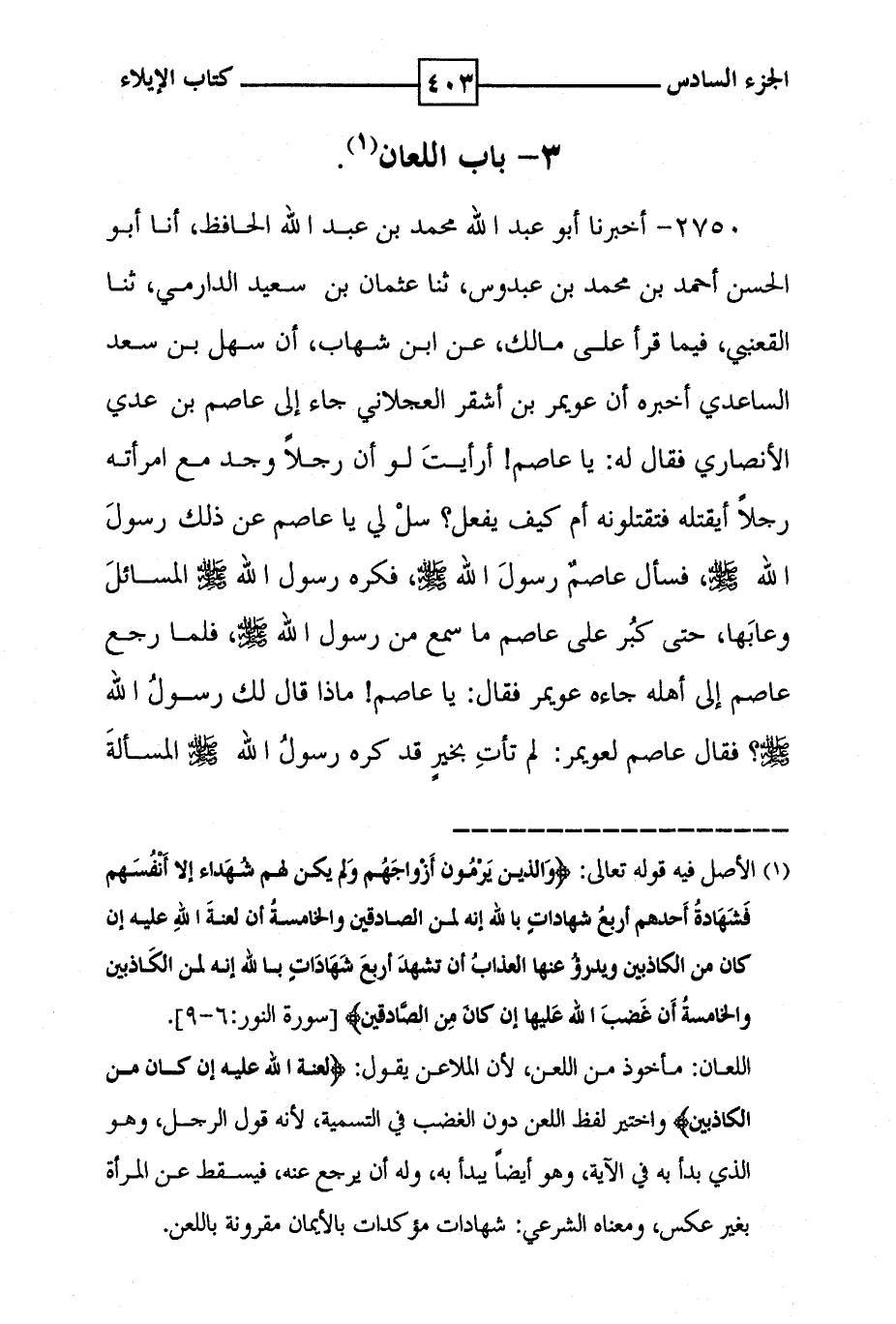 3 - باب اللعان ( 1 ) 2750 - أخبرنا أبو عبد الله محمد بن عبد الله الحافظ ، أنا أبو الحسن أحمد بن محمد بن عبدوس ، ثنا عثمان بن سعيد الدارمي ، ثنا القعنبي ، فيما قرأ على مالك ، عن ابن شهاب ، أن سهل بن سعد الساعدي اخبره أن عويمر بن اشقر العجلاني جاء إلى عاصم بن عدي الأنصاري فقال له : يا عاصم ! أرأيت لو أن رجلا وجد مع امرأته رجلا أيقتله فتقتلونه أم كيف يفعل ؟ سل لي يا عاصم عن ذلك رسول الله صلى الله عليه وسلم ، فسأل عاصم رسول الله صلى الله عليه وسلم ، فكره رسول الله صلى الله عليه وسلم المسائل وعابها ، حتى كبر على عاصم ما سمع من رسول الله صلى الله عليه وسلم ، فلما رجع عاصم إلى أهله جاءه عويمر فقال : يا عاصم ! ماذا قال لك رسول الله صلى الله عليه وسلم ؟ فقال عاصم لعويمر : لم تأت بخير قد كره رسول الله صلى الله عليه وسلم المسألة
