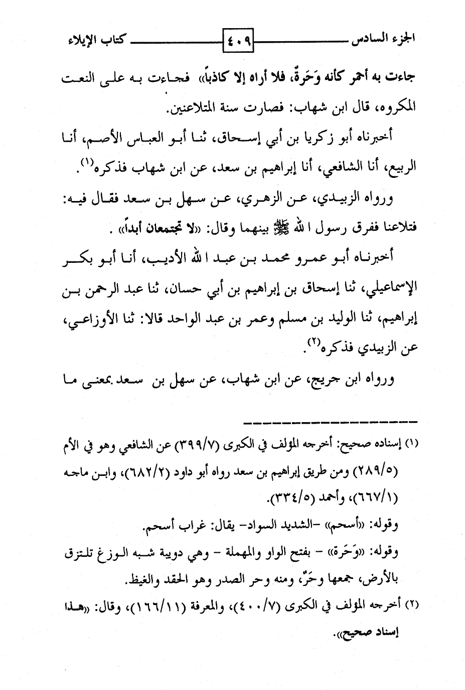 جاءت به احمر كأنه وحرة ، فلا أراه إلا كاذباً فجاءت به على النعت المكروه ، قال ابن شهاب : فصارت سنة المتلاعنين . أخبرناه أبو زكريا بن أبي اسحاق ، ثنا أبو العباس الاصم ، أنا الربيع ، أنا الشافعي ، أنا إبراهيم بن سعد ، عن ابن شهاب فذكره ( 1 ) . ورواه الزبيدي ، عن الزهري ، عن سهل بن سعد فقال فيه : فتلاعنا ففرق رسول الله صلى الله عليه وسلم بينهما وقال : ' لا تجتمعان أبدا ' . أخبرناه أبو عمرو محمد بن عبد الله الاديب ، أنا أبو بكر الاسماعيلي ، ثنا إسحاق بن إبراهيم بن أبي حسان ، ثنا عبد الرحمن بن إبراهيم ، ثنا الوليد بن مسلم وعمر بن عبد الواحد قالا : ثنا الاوزاعي ، عن الزبيدي فذكره . ورواه ابن جريج ، عن ابن شهاب ، عن سهل بن سعد بمعنى ما
