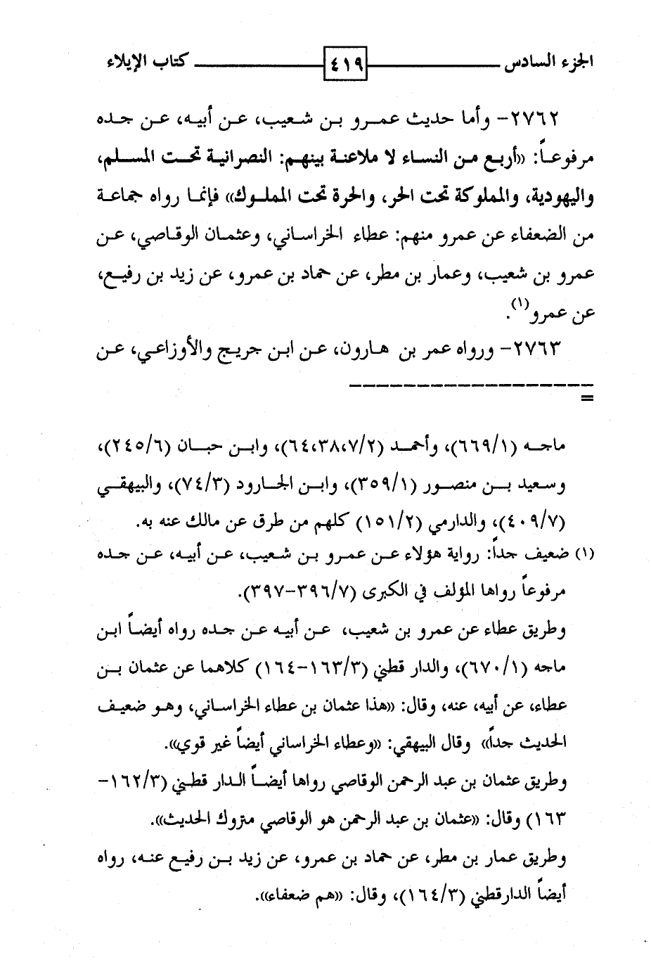 2762 - وأما حديث عمرو بن شعيب ، عن ابيه ، عن جده مرفوعا : ' أربع من النساء لا ملاعنة بينهم : النصرانية تحت المسلم ، واليهودية ، والمملوكة تحت الحر ، والحرة تحت المملوك ' فإنما رواه جماعة من الضعفاء عن عمرو منهم : عطاء الخراساني ، وعثمان الوقاصي ، عن عمرو بن شعيب ، وعمار بن مطر ، عن حماد بن عمرو ، عن زيد بن رفيع ، عن عمرو ( 1 ) .
