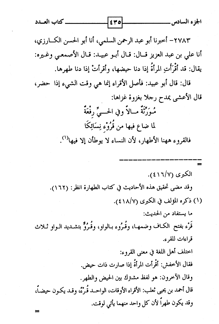 2783 - أخبرنا أبو عبد الرحمن السلمي ، أنا أبو الحسن الكارزي ، أنا علي بن عبد العزيز قال : قال أبو عبيد : قال الاصمعي وغيره : يقال : قد اقرأت المرأة إذا دنا حيضها ، وأقرأت إذا دنا طهرها . قال : قال أبو عبيد : فأًصل الاقراء إنما هي وقت الشيء إذا حضر ، قال الأعشى يمدح رجلا بغزوة غزاها : ( مورثة مالا وفي الحي رفعة ) ( لما ضاع فيها من قروء نسائكا ) فالقروء ههنا الاطهار ، لأن النساء لا يوطأن إلا فيها ( 1 ) .