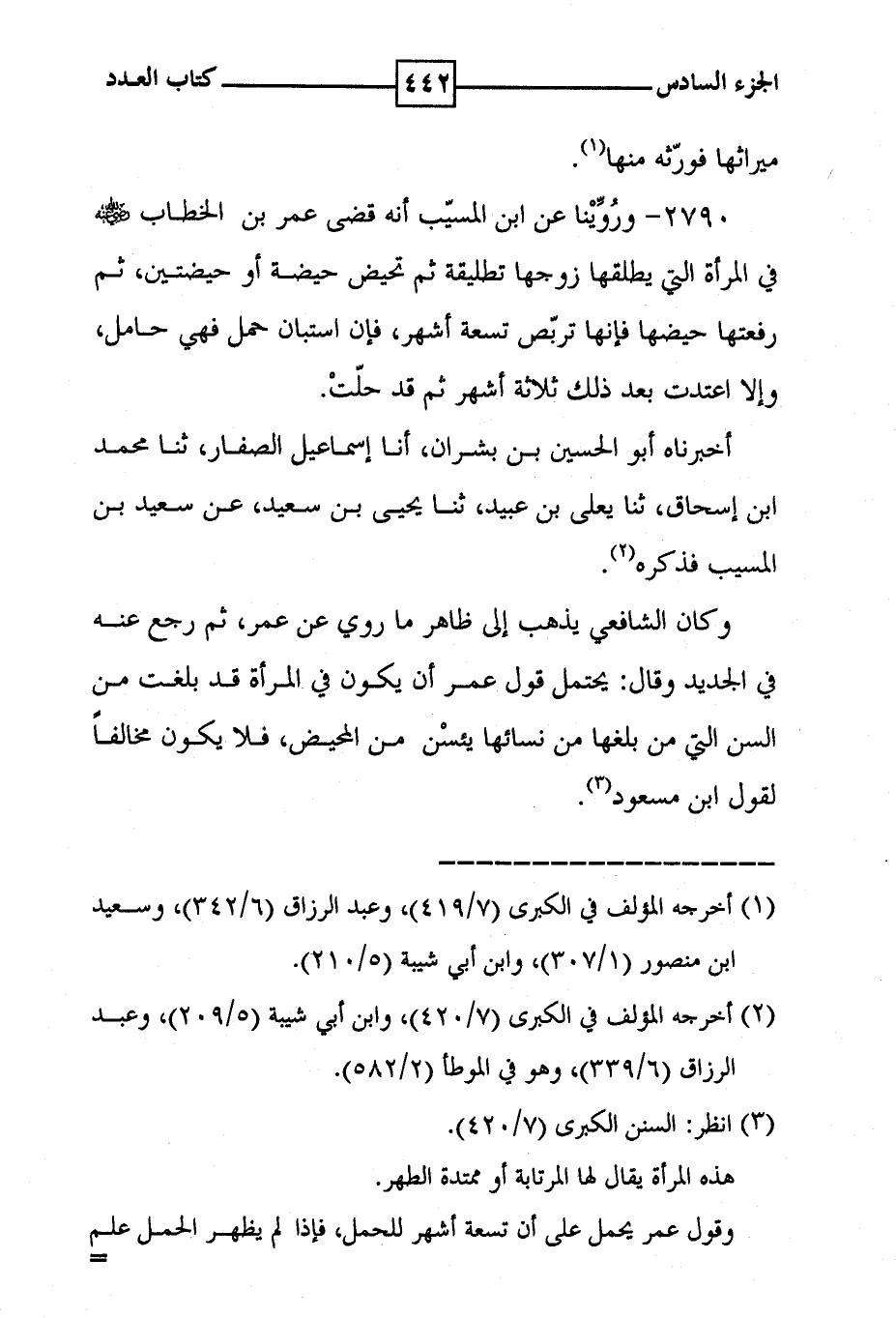 2790 - وروينا عن ابن المسيب انه قضى عمر بن الخطاب رضي الله عنه في المرأة التي يطلقها زوجها تطليقة ثم تحيض حيضة أو حيضتين ، ثم رفعتها حيضها فإنها تربص تسعة أشهر ، فإن استبان حمل فهي حامل ، وإلا اعتدت بعد ذلك ثلاثة اشهر ثم قد حلت . أخبرناه أبو الحسين بن بشران ، أنا إسماعيل الصفار ، ثنا محمد ابن اسحاق ، ثنا يعلى بن عبيد ، ثنا يحيى بن سعيد ، عن سعيد بن المسيب فذكره ( 2 ) . وكان الشافعي يذهب إلى ظاهر ما روي عن عمر ، ثم رجع عنه في الجديد وقال : يحتمل قول عمر أن يكون في المرأة قد بلغت من السن التي من بلغها من نسائها يئسن من المحيض ، فلا يكون مخالفا لقول ابن مسعود ( 3 ) .