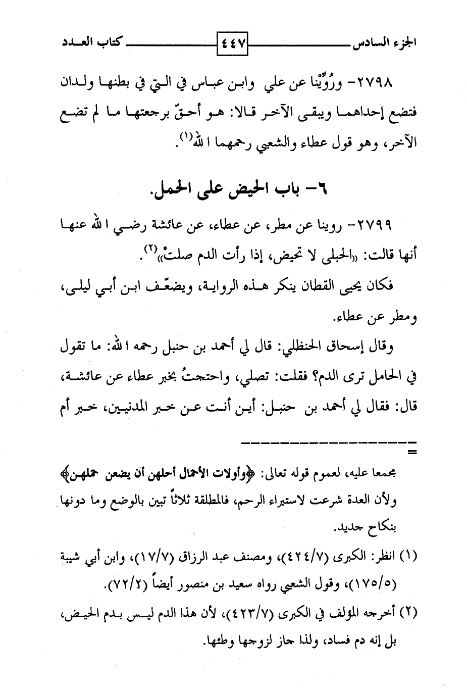 2798 - وروينا عن علي وابن عباس في التي في بطنها ولدان فتضع إحداهما ويبقى الآخر قالا : هو أحق برجعتها ما لم تضع الآخر ، وهو قول عطاء والشعبي رحمهما الله ( 1 ) . 6 - باب الحيض على الحمل