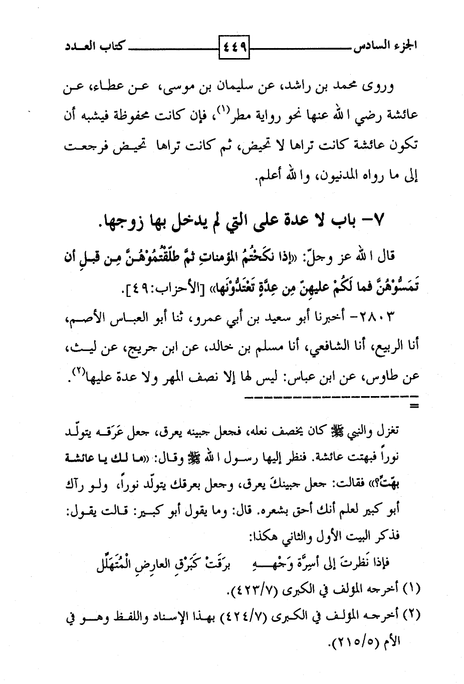 وروى محمد بن راشد ، عن سليمان بن موسى ، عن عطاء ، عن عائشة رضي الله عنها نحو رواية مطر ( 1 ) ، فإن كانت محفوظة فيشبه أن تكون عائشة كانت تراها لا تحيض ، ثم كانت تراها تحيض فرجعت إلى ما رواه المدنيون ، والله أعلم . 7 - باب لا عدة على التي لم يدخل بها زوجها قال الله عز وجل : ! ( إذا نكحتم المؤمنات ثم طلقتموهن من قبل أن تمسوهن فما لكم عليهن من عدة تعتدونها ) ! [ الاحزاب : 49 ] .