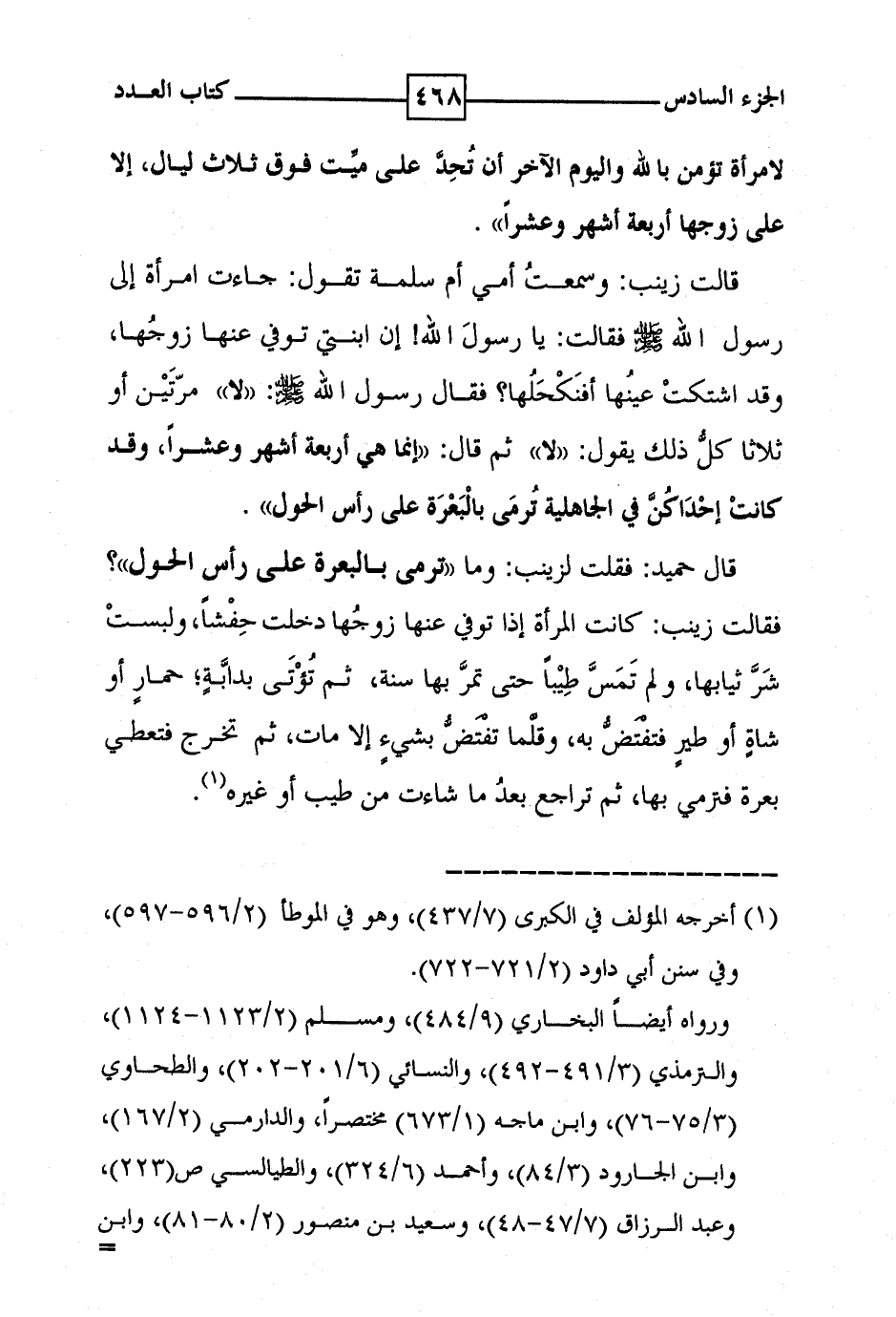لامرأة تؤمن بالله واليوم الآخر أن تحد على ميت فوق ثلاث ليال ، إلا على زوجها أربعة اشهر وعشرا ' . قالت زينب : وسمعت أمي أم سلمة تقول : جاءت امرأة إلى رسول الله فقالت : يا رسول الله ! إن ابنتي توفي عنها زوجها ، وقد اشتكت عينها أفنكحلها ؟ فقال رسول الله صلى الله عليه وسلم : ' لا ' مرتين أو ثلاثا كل ذلك يقول : ' لا ' ثم قال : ' إنما هي أربعة اشهر وعشرا ، وقد كانت إحداكن في الجاهلية ترمى بالبعرة على رأس الحول ' . قال حميد : فقلت لزينب : وما ' ترمى بالبعرة على رأس الحول ' ؟ فقالت زينب : كانت المرأة إذا توفي عنها زوجها دخلت حفشا ، ولبست شر ثيابها ، ولم تمس طيبا حتى تمر بها سنة ، ثم تؤتى بدابة ؛ حمار أو شاة أو طير فتفتض به ، وقلما تفتض بشيء إلا مات ، ثم تخرج فتعطي بعرة فترمي بها ، ثم تراجع بعد ما شاءت من طيب أو غيره ( 1 ) .