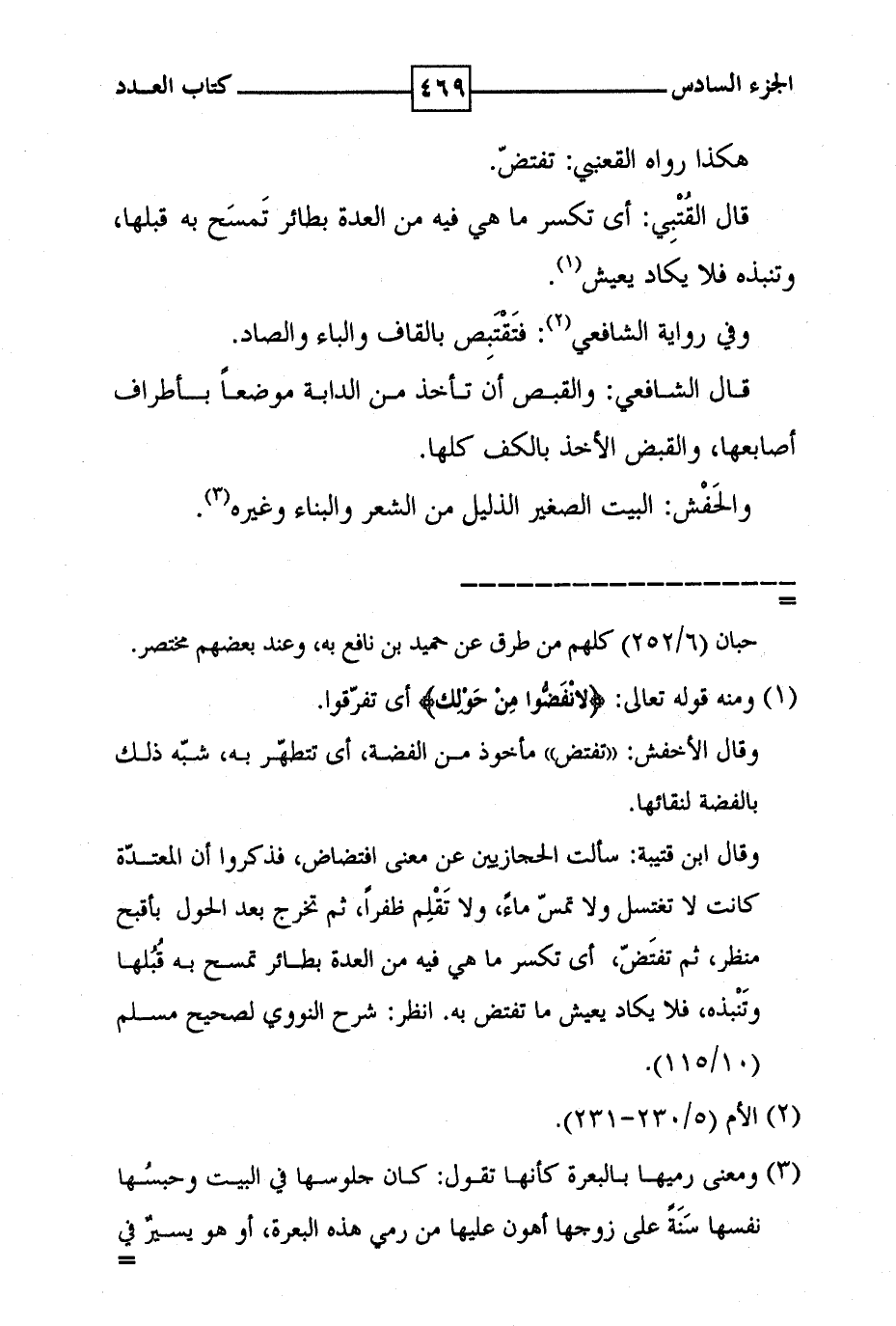هكذا رواه القعنبي : تفتض . قال : القتبي : أى تكسر ما هي في من العدة بطائر تمسح به قبلها ، وتنبذه فلا يكاد يعيش ( 1 ) . وفي رواية الشافعي ( 2 ) : فتقتبص بالقاف والباء والصاد . قال الشافعي : والقبص أن تأخذ من الدابة موضعا بأطراف اصابعها ، والقبض الأخذ بالكف كلها . والحفش : البيت الصغير الذليل من الشعر والبناء وغيره ( 3 ) .