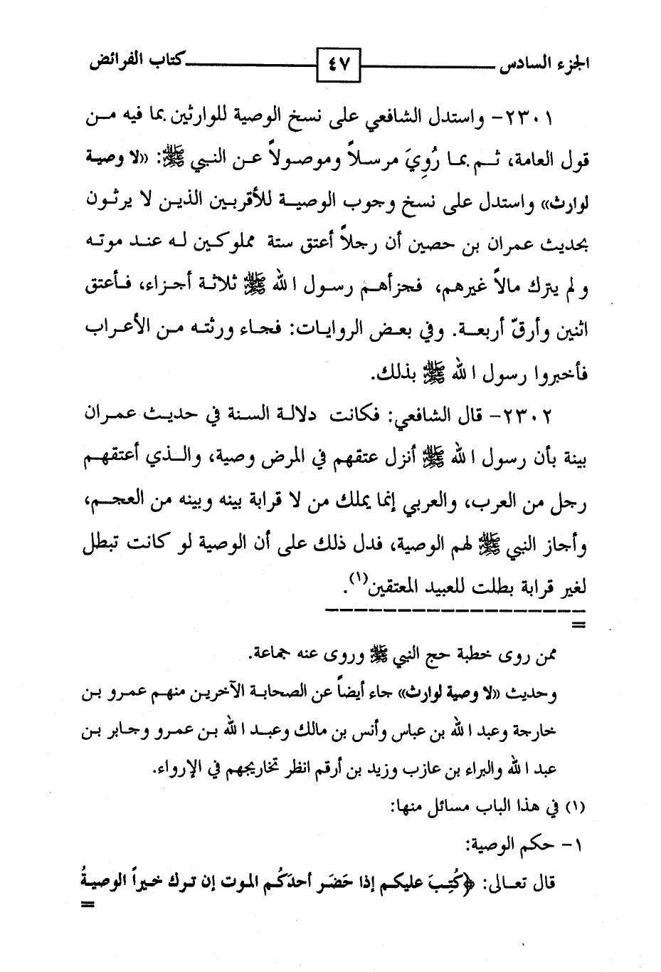 2301 - واستدل الشافعي على نسخ الوصية للوارثين بما فيه من قول العامة ، ثم بما روي مرسلا وموصولا عن النبي صلى الله عليه وسلم : ' لا وصية لوارث ' واستدل على نسخ وجوب الوصية للأقربين الذين لا يرثون بحديث عمران بن حصين أن رجلا اعتق ستة مملوكين له عند موته ولم يترك حالا غيرهم ، فجزأهم رسول الله صلى الله عليه وسلم ثلاثة أجزاء ، فأعتق اثنين وأرق أربعة . وفي بعض الروايات : فجاء ورثته من الأعراب فأخبروا رسول الله صلى الله عليه وسلم بذلك .