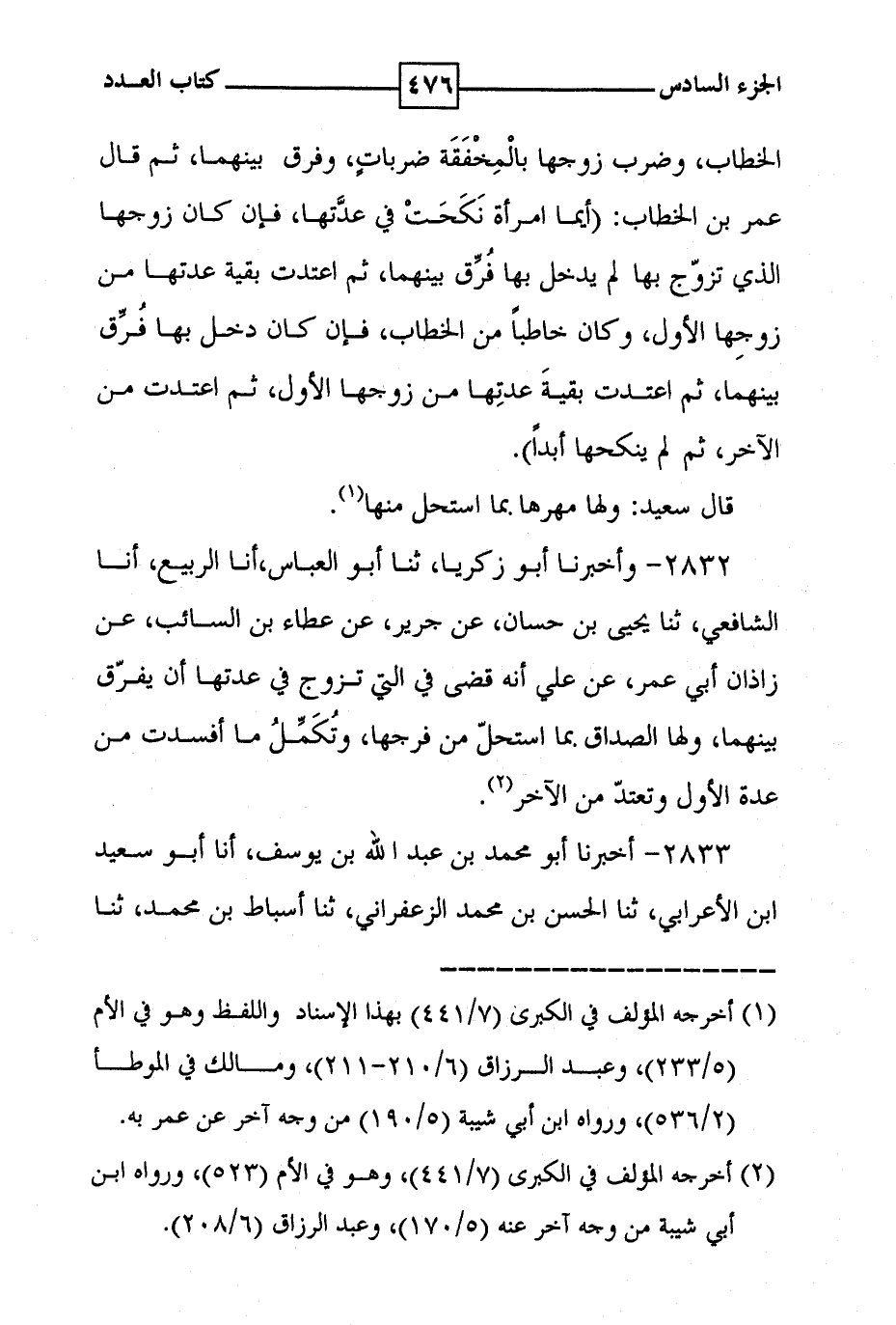 2832 - واخبرنا أبو زكريا ، ثنا أبو العباس ، أنا الربيع ، أنا الشافعي ، ثنا يحيى بن حسان ، عن جرير ، عن عطاء بن السائب ، عن زاذان أبي عمر ، عن علي انه قضى في التي تزوج في عدتها أن يفرق بينهما ، ولها الصداق بما استحل من فرجها ، وتكمل ما افسدت من عدة الأول وتعتد من الآخر ( 2 ) .