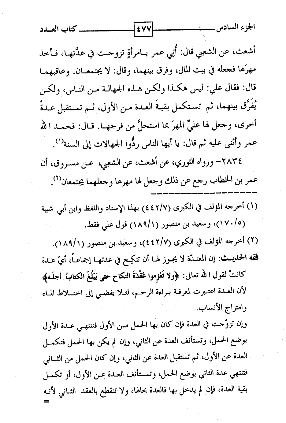 أشعث ، عن الشعبي قال : أتي عمر بامرأة تزوجت في عدتها ، فأخذ مهرها فجعله في بيت المال ، وفرق بينهما ، وقال : لا يجتمعان . وعاقبهما قال : فقال علي : ليس هكذا ولكن هذه الجهالة من الناس ، ولكن يفرق بينهما ، ثم تستكمل بقية العدة من الاول ، ثم تستقبل عدة أخرى ، وجعل لها علي المهر بما استحل من فرجها . قال : فحمد الله عمر وأثنى عليه ثم قال : يا أيها الناس ردوا الجهالات إلى السنة ( 1 ) .