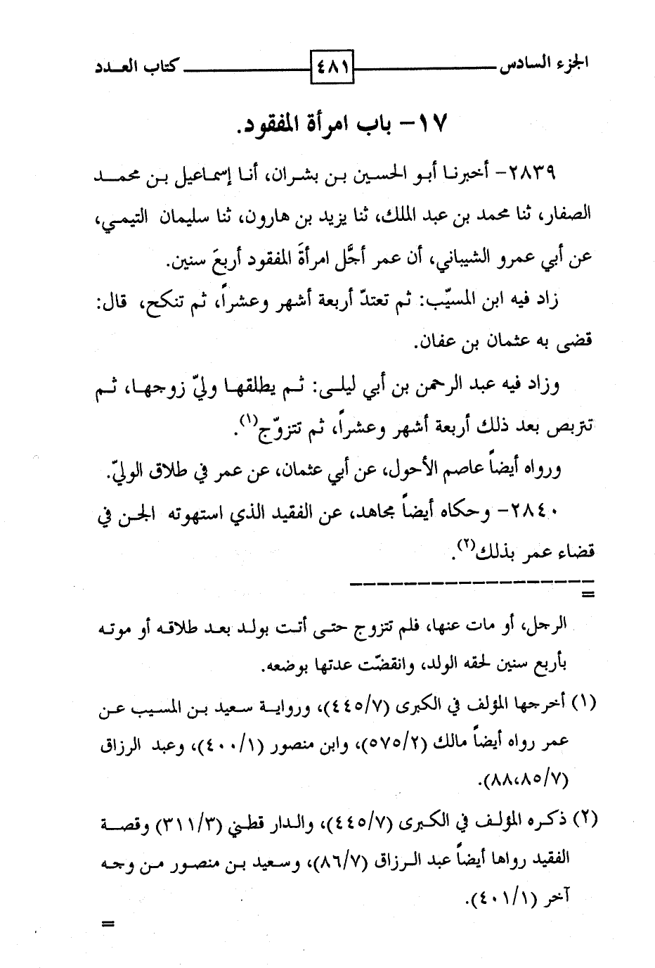 2829 - أخبرنا أبو الحسين بن بشران ، أنا إسماعيل بن محمد الصفار ، ثنا محمد بن عبد الملك ، ثنا يزيد بن هارون ، ثنا سليمان التيمي ، عن أبي عمرو الشيباني ، أن عمر اجل امرأة المفقود أربع سنين . زاد فيه ابن المسيب : ثم تعتد أربعة اشهر وعشرا ، ثم تنكح ، قال : قضى به عثمان بن عفان . وزاد فيه عبد الرحمن بن أبي ليلى : ثم يطلقها ولي زوجها ، ثم تتربص بعد ذلك أربعة اشهر وعشرا ، ثم تتزوج ( 1 ) . ورواه أيضا عاصم الأحول ، عن أبي عثمان ، عن عمر في طلاق الولي . 2840 - وحكاه أيضا مجاهد ، عن الفقيد الذي استهوته الجن في قضاء عمر بذلك ( 2 ) .