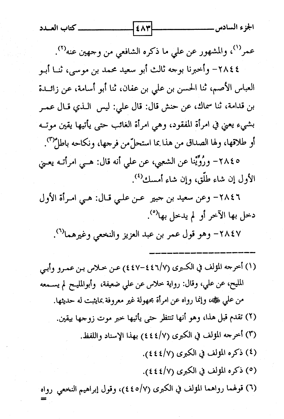 2844 - واخبرنا بوجه ثلاث أبو سعيد محمد بن موسى ، ثنا أبو العباس الأصم ، ثنا الحسن بن علي بن عفان ، ثنا أبو اسامة ، عن زائدة بن قدامة ، ثنا سماك ، عن حنش قال : قال علي : ليس الذي قال عمر بشيء يعني في امرأة المفقود ، وهي امرأة الغائب حتى يأتيها يقين موته أو طلاقها ، ولها الصداق من هذا بما استحل من فرجها ، ونكاحه باطل ( 3 ) .