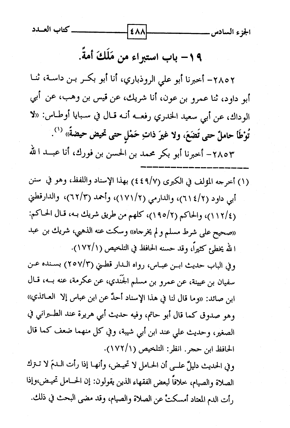 2852 - أخبرنا أبو علي الروذباري ، أنا أبو بكر بن داسة ، ثنا أبو داود ، ثنا عمرو بن عون ، أنا شريك ، عن قيس بن وهب ، عن أبي الوداك ، عن أبي سعيد الخدري رفعه انه قال في سبايا اوطاس : ' لا توطأ حامل حتى تضع ، ولا غير ذات حمل حتى تحيض حيضة ' ( 1 ) .