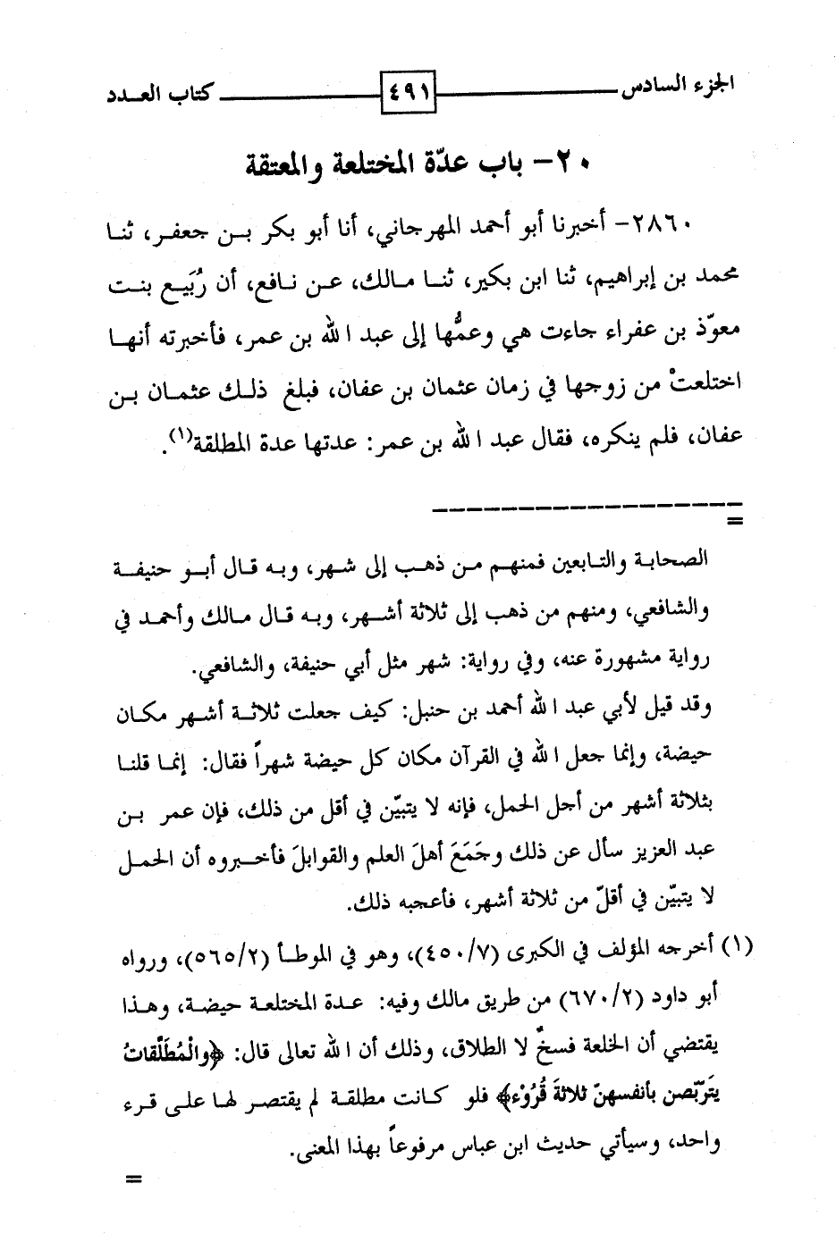 2860 - أخبرنا أبو أحمد المهرجاني ، أنا أبو بكر بن جعفر ، ثنا محمد بن إبراهيم ، ثنا ابن بكير ، ثنا مالك ، عن نافع ، أن ربيع بنت معوذ بن عفراء جاءت هي وعمها إلى عبد الله بن عمر ، فأخبرته انها اختلعت من زوجها في زمان عثمان بن عفان ، فبلغ ذلك عثمان بن عفان ، فلم ينكره ، فقال عبد الله بن عمر : عدتها عدة المطلقة ( 1 ) .