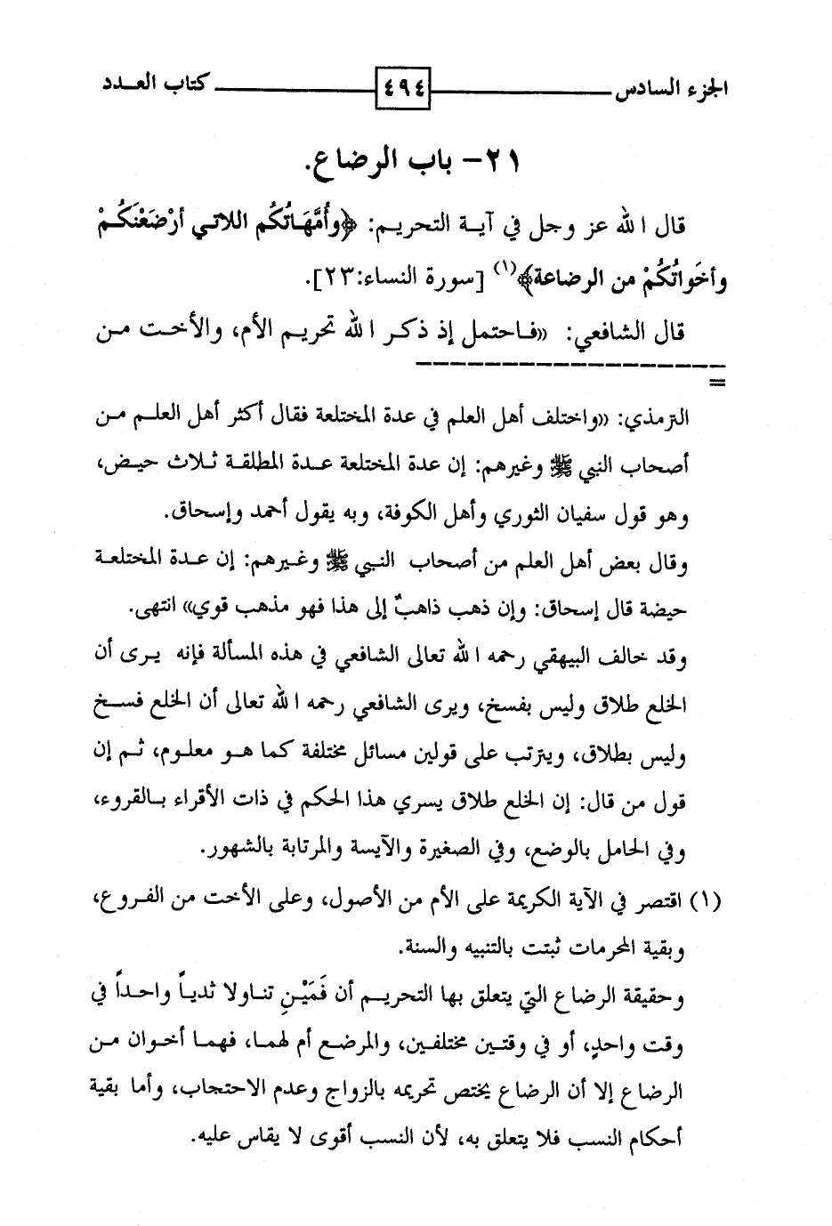 21 - باب الرضاع قال الله عز وجل في آية التحريم : ( وأمهاتكم اللاتي وارضعنكم واخواتكم من الرضاعة ) ( 1 ) [ سورة النساء : 23 ] . قال الشافعي : ' فاحتمل إذ ذكر الله تحريم الأم ، والأخت من