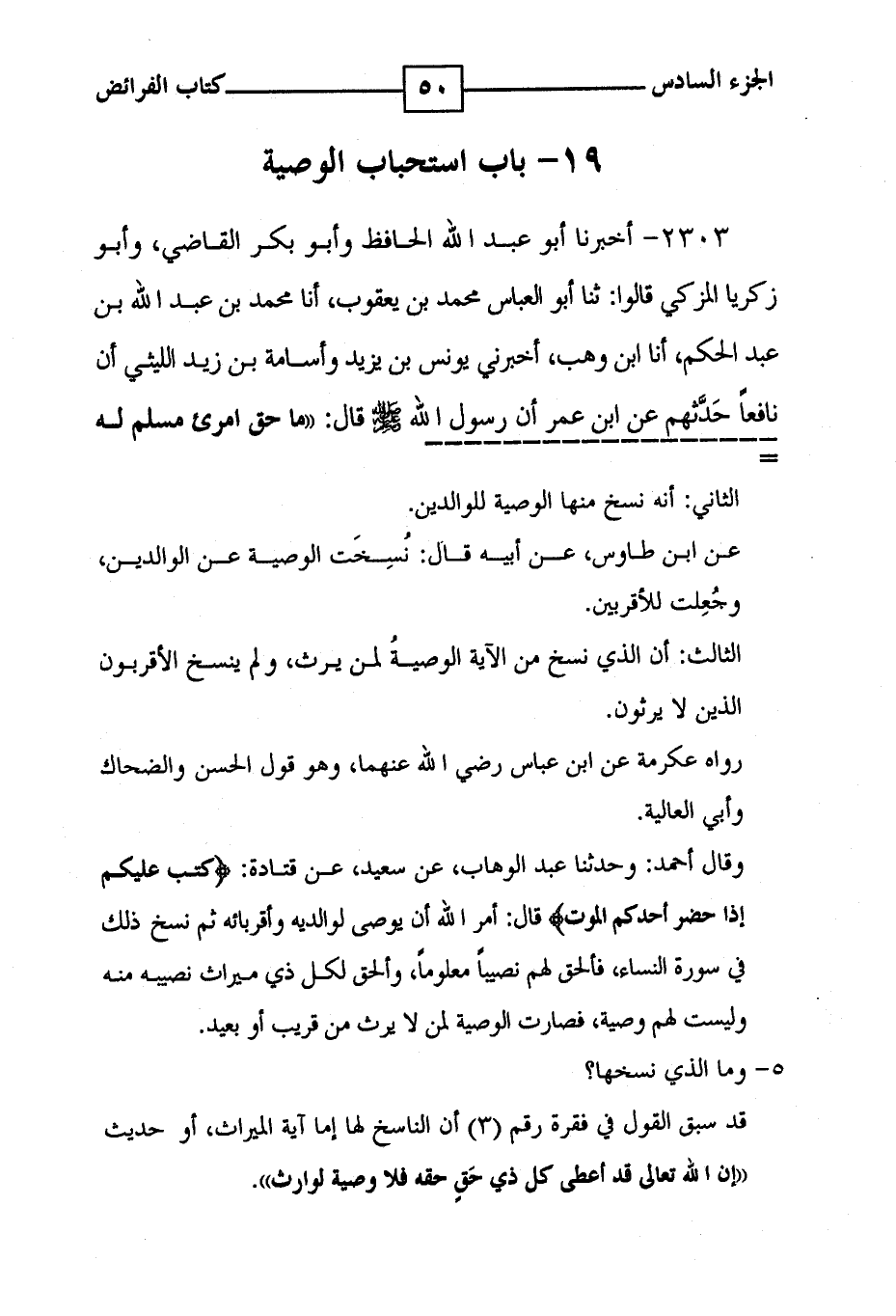 2303 - أخبرنا أبو عبد الله الحافظ وأبو بكر القاضي ، وأبو زكريا المزكي قالوا : ثنا أبو العباس محمد بن يعقوب ، أنا محمد بن عبد الله بن عبد الحكم ، أنا ابن وهب ، اخبرني يونس بن يزيد واسامة بن زيد الليثي أن نافعا حدثهم عن ابن عمر أن رسول الله صلى الله عليه وسلم قال : ' ما حق امرئ مسلم له