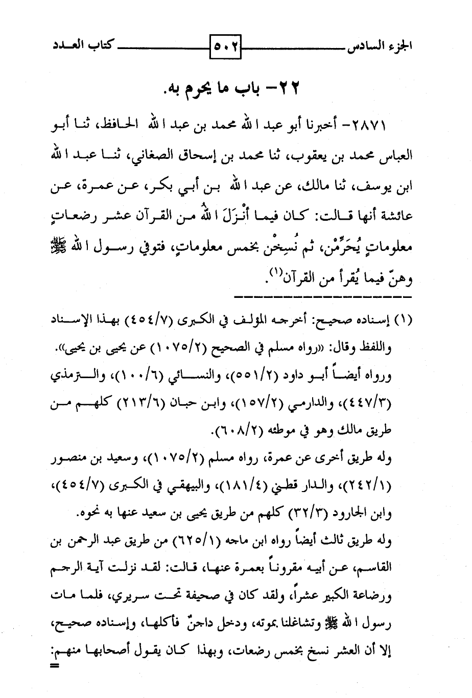 2871 - أخبرنا أبو عبد الله محمد بن عبد الله الحافظ ، ثنا أبو العباس محمد بن يعقوب ، ثنا محمد بن إسحاق الصغاني ، ثنا عبد الله ابن يوسف ، ثنا مالك ، عبد الله بن أبي بكر ، عن عمرة ، عن عائشة انها قالت : كان فيما انزل الله من القرآن عشر رضعات معلومات يحرمن ، ثم نسخن بخمس معلومات ، فتوفي رسول الله صلى الله عليه وسلم وهن فيما يقرأ من القرآن ( 1 ) .