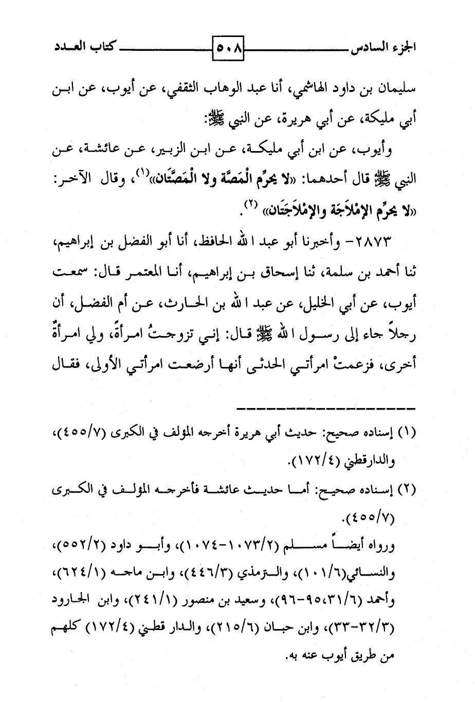 2873 - واخبرنا أبو عبد الله الحافظ ، أنا أبو الفضل بن ابراهيم ، ثنا أحمد بن سلمة ، ثنا إسحاق بن ابراهيم ، أنا المعتمر قال : سمعت ايوب ، عن أبي الخليل ، عن عبد الله بن الحارث ، عن أم الفضل ، أن رجلا جاء إلى رسول الله صلى الله عليه وسلم قال : إني تزوجت امرأة ، ولي امرأة اخرى ، فزعمت امرأتي الحدثى انها ارضعت امرأتي الاولى ، فقال
