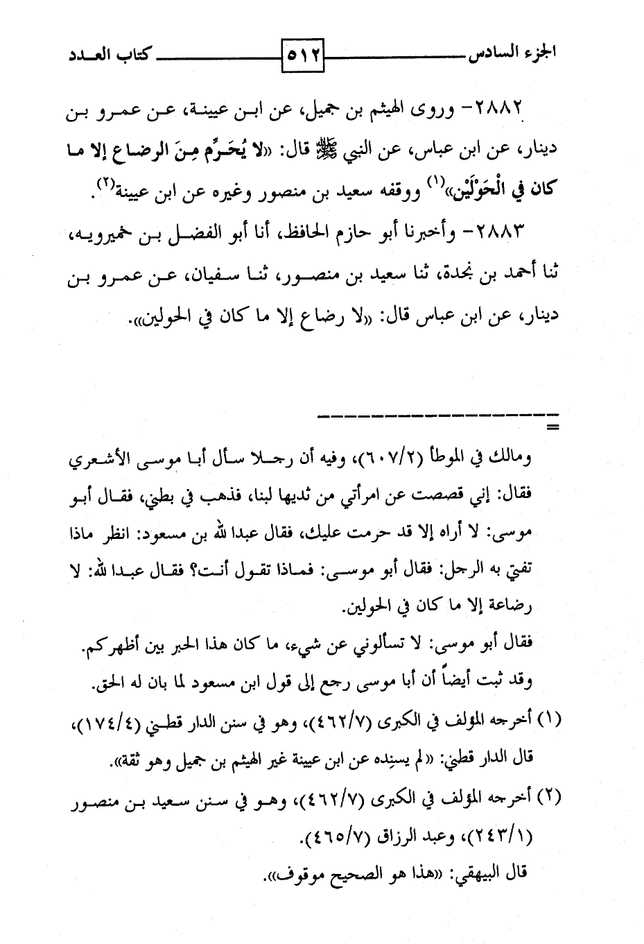 2882 - وروى الهيثم بن جميل ، عن ابن عيينة ، عن عمرو بن دينار ، عن ابن عباس ، عن النبي صلى الله عليه وسلم قال : ' لا يحرم من الرضاع إلا ما كان في الحولين ' ( 1 ) ووقفه سعيد بن منصور وغيره عن أبن عيينة ( 2 ) .