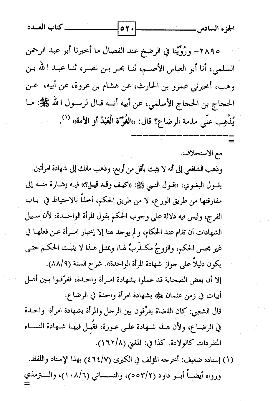 2895 - وروينا في الرضخ عند الفصال ما أخبرنا أبو عبد الرحمن السلمي ، أنا أبو العباس الاصم ، ثنا بحر بن نصر ، ثنا عبد الله بن وهب ، اخبرني عمرو بن الحارث ، عن هشام بن عروة ، عن ابيه ، عن الحجاج بن الحجاج الاسلمي ، عن أبيه انه قال لرسول الله صلى الله عليه وسلم : ما يذهب عني مذمة الرضاع ؟ قال : ' الغرة العبد أو الأمة ' ( 1 ) .