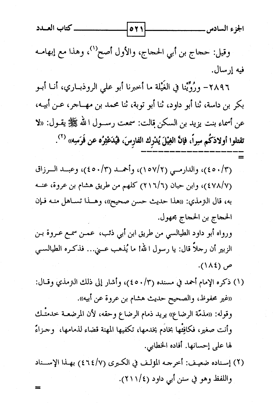 2896 - وروينا في الغيلة ما أخبرنا أبو علي الروذباري ، أنا أبو بكر بن داسة ، ثنا أبو داود ، ثنا أبو توبة ، ثنا محمد بن مهاجر ، عن ابيه ، عن أسماء بنت يزيد بن السكن قالت : سمعت رسول الله صلى الله عليه وسلم يقول : ' لا تقتلوا اولادكم سرا ، فإن الغيل يدرك الفارس ، فيدعثره عن فرسه ' ( 2 ) .