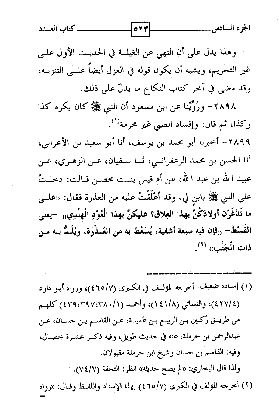 2899 - أخبرنا أبو محمد بن يوسف ، أنا أبو سعيد بن الاعرابي ، أنا الحسن بن محمد الزعفراني ، ثنا سفيان ، عن الزهري ، عن عبيد الله بن عبد الله ، عن أم قيس بنت محصن قالت : دخلت على النبي صلى الله عليه وسلم بابن لي ، وقد اعلقت عليه من العذرة فقال : ' علي ما تدغرن اولادكن بهذا العلاق ؟ عليكن بهذا العود الهندي ' - يعني القسط - ' فإن فيه اشفية ، يسعط به من العذرة ، ويلد به من ذات الجنب ' ( 2 ) .