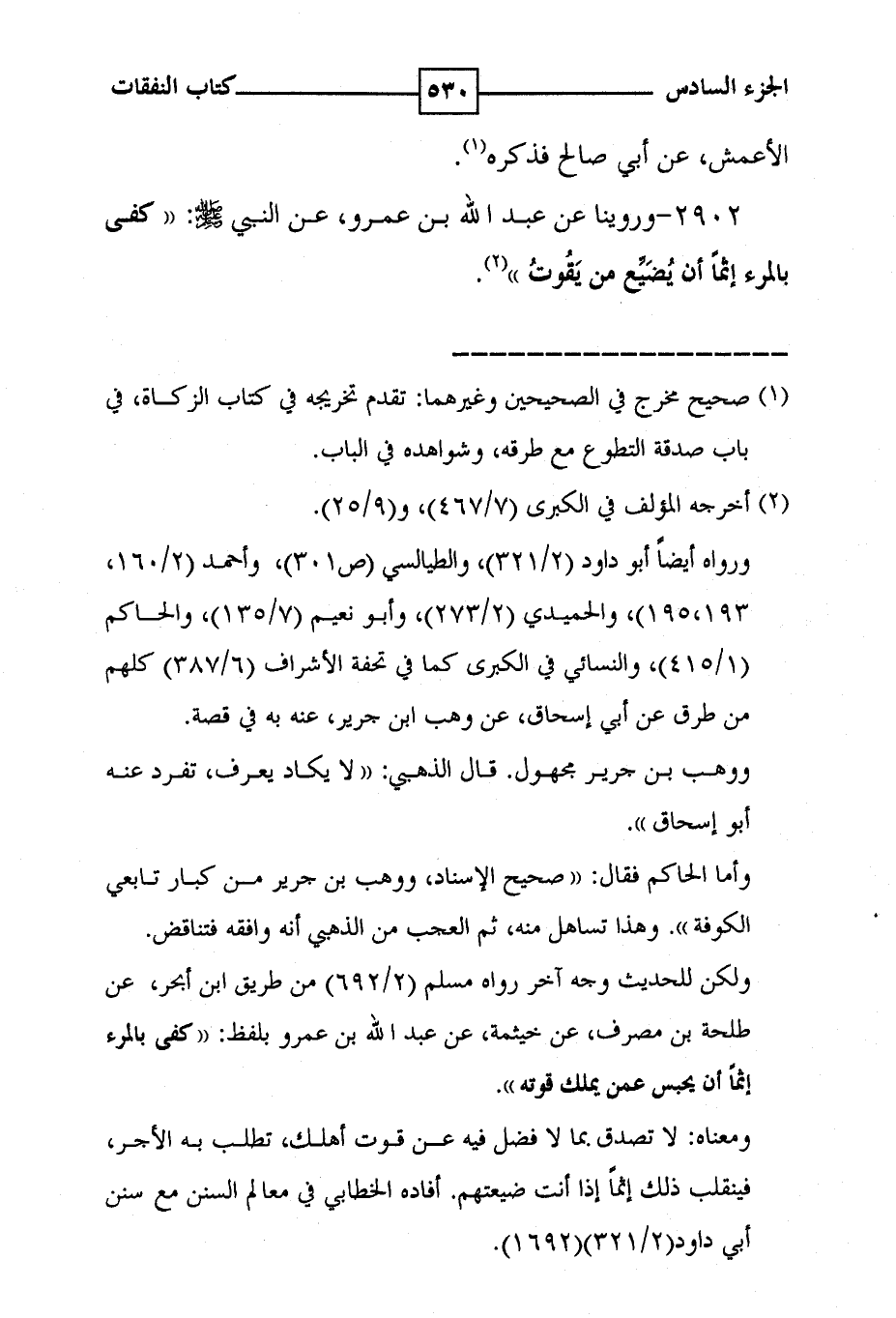 2902 - وروينا عن عبد الله بن عمرو ، عن النبي صلى الله عليه وسلم : ' كفى بالمرء إثما أن يضيع من يقوت ' ( 2 ) .