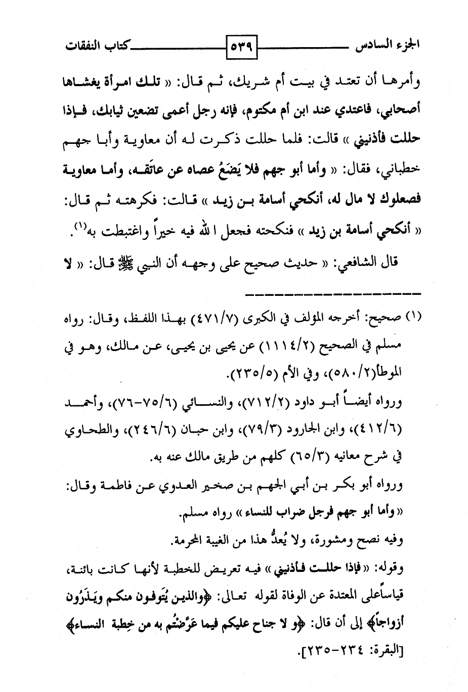 وأمرها أن تعتد في بيت أم شريك ، ثم قال : ' تلك امرأة يغشاها اصحابي ، فاعتدي عند ابن أم مكتوم ، فإن رجل اعمى تضعين ثيابك ، فإن حللت فأذنيني ' قالت : فلما حللت ذلرت له أن معاوية وابا جهم خطباني ، فقال : ' وأما أبو جهم فلا يضع عصاه عن عاتقه ، واما معاوية فصعلوك لا مال له ، انكحي أسامة بن زيد ' قالت : فكرهته ثم قال : ' انكحي أسامة بن زيد ' فنحكته فجعل الله فيه خيرا واغتبطت به ( 1 ) . قال الشافعي : ' حديث صحيح على وجهه أن النبي صلى الله عليه وسلم قال : ' لا