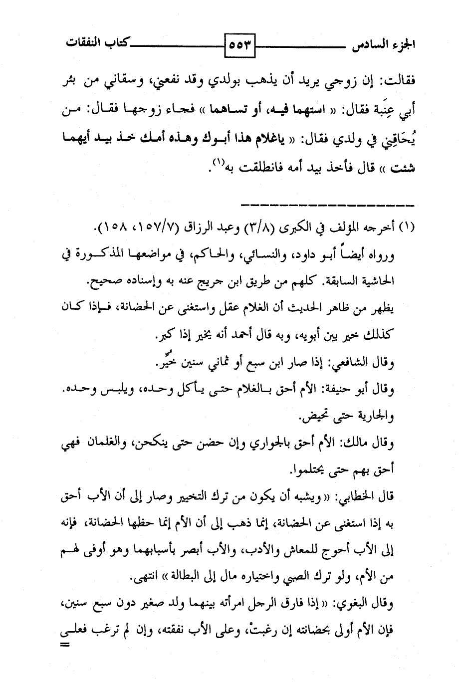 فقالت : إن زوجي يريد أن يذهب بولدي وقد نفعني ، وسقاني من بئر أبي عنبة فقال : ' استهما فيه ، أو تساهما ' فجاء زوجها فقال : من يحاقني في ولدي فقال : ' يا غلام هذا ابوك وهذه امك خذ بيد ايهما شئت ' قال فأخذ بيد أمه فانطلقت به ( 1 ) .