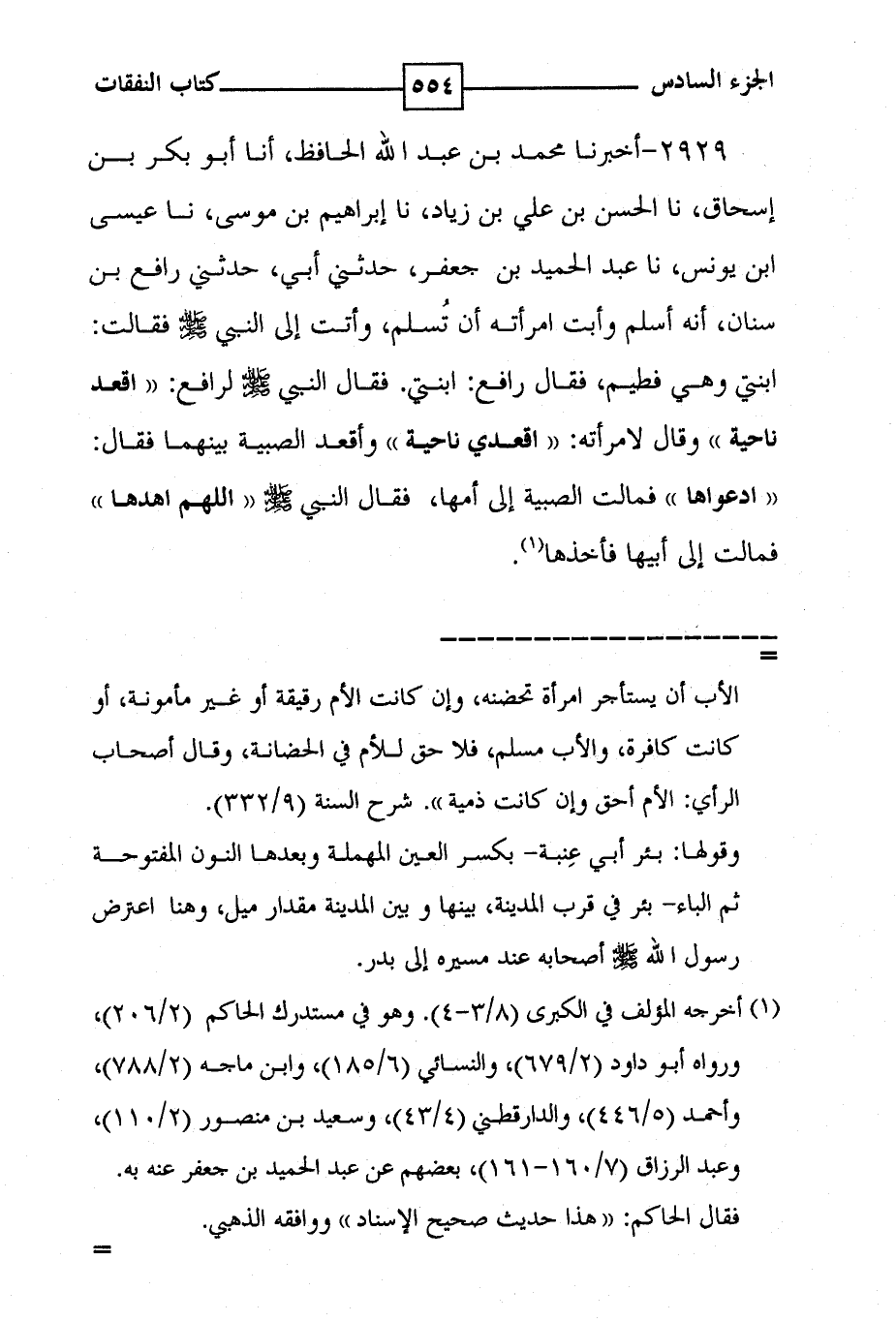 2929 - - أخبرنا محمد بن عبد الله الحافظ ، أنا أبو بكر بن إسحاق ، نا الحسن بن علي بن زياد ، نا إبراهيم بن موسى ، نا عيسى ابن يونس ، نا عبد الحميد بن جعفر ، حدثني ابي ، حدثني رافع بن سنان ، أن اسلم وأبت امرأته أن تسلم ، وأتت إلى النبي صلى الله عليه وسلم فقالت : ابنتي وهي فطيم ، فقال رافع : ابنتي . فقال النبي صلى الله عليه وسلم لرافع : ' اقعد ناحية : وقال : لامرأته : ' أقعدي ناحية ' واقعد الصبية بينهما فقال : ' ادعواها ' فمالت الصبية إلى إمها ، فقال النبي صلى الله عليه وسلم ' اللهم اهدها ' فمالت إلى أبيها فأخذها ( 1 ) .