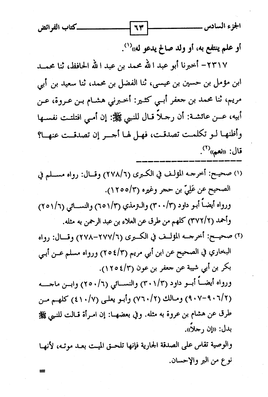 2317 - أخبرنا أبو عبد الله محمد بن عبد الله الحافظ ، ثنا محمد ابن مؤمل بن حسين بن عيسى ، ثنا الفضل بن محمد ، ثنا سعيد بن أبي مريم ، ثنا محمد بن جعفر أبي كثير : اخبرني هشام بن عروة ، عن ابيه ، عن عائشة : أن رجلا قال للنبي صلى الله عليه وسلم : إن أمي افتلتت نفسها وأظنها لو تكلمت تصدقت ، فهل لها أجر إن تصدقت عنها ؟ قال : ' نعم ' ( 2 ) .