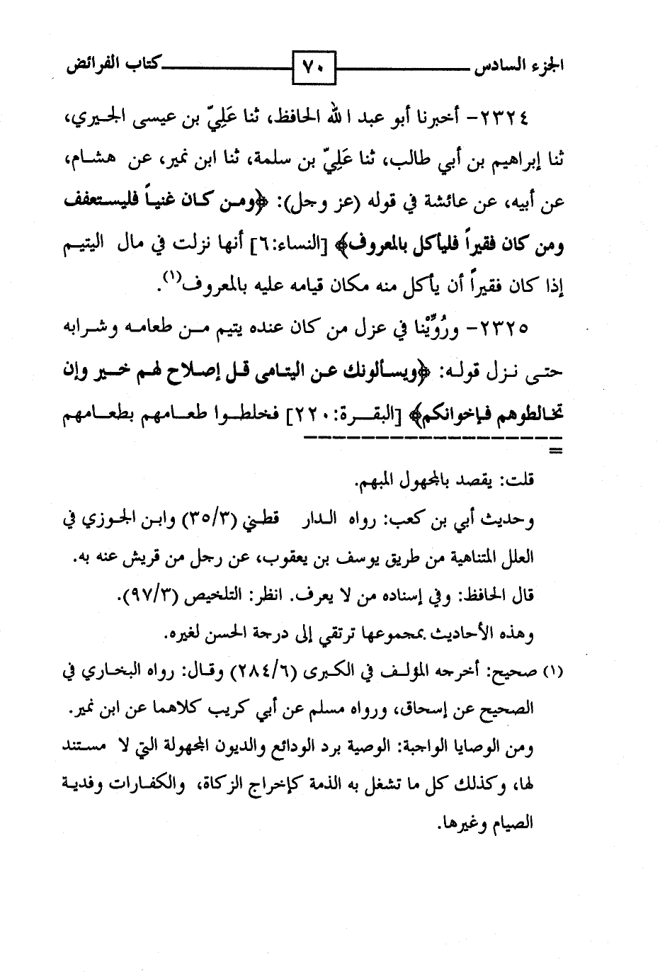 2325 - وروينا في عزل من كان عنده يتيم من طعامه وشرابه حتى نزل قوله : ! ( ويسألونك عن اليتامى قل إصلاح لهم خير وإن تخالطوهم فإخوانكم ) ! [ البقرة : 220 ] فخلطوا طعامهم بطعامهم