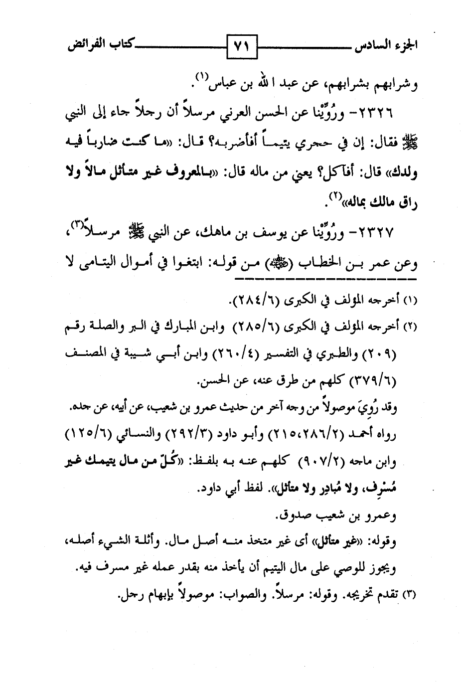 2326 - وروينا عن الحسن العرني مرسلا أن رجلا جاء إلى النبي صلى الله عليه وسلم فقال : إن في حجري يتيما أفأضربه ؟ قال : ' ما كنت ضاربا فيه ولدك ' قال : أفآكل ؟ يعني من ماله قال : ' بالمعروف غير متآثل مالا ولا راق مالك بماله ' ( 2 ) .