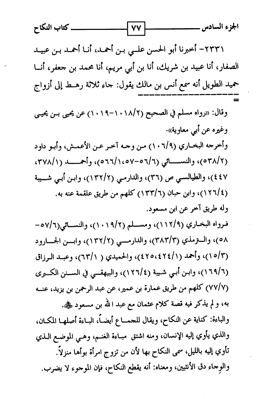 2331 - أخبرنا أبو الحسن علي بن احمد ، أنا أحمد بن عبيد الصفار ، أنا عبيد بن شريك ، أنا بن أبي مريم ، أنا محمد بن جعفر ، أنا حميد الطويل انه سمع أنس بن مالك يقول : جاء ثلاثة رهط إلى ازواج