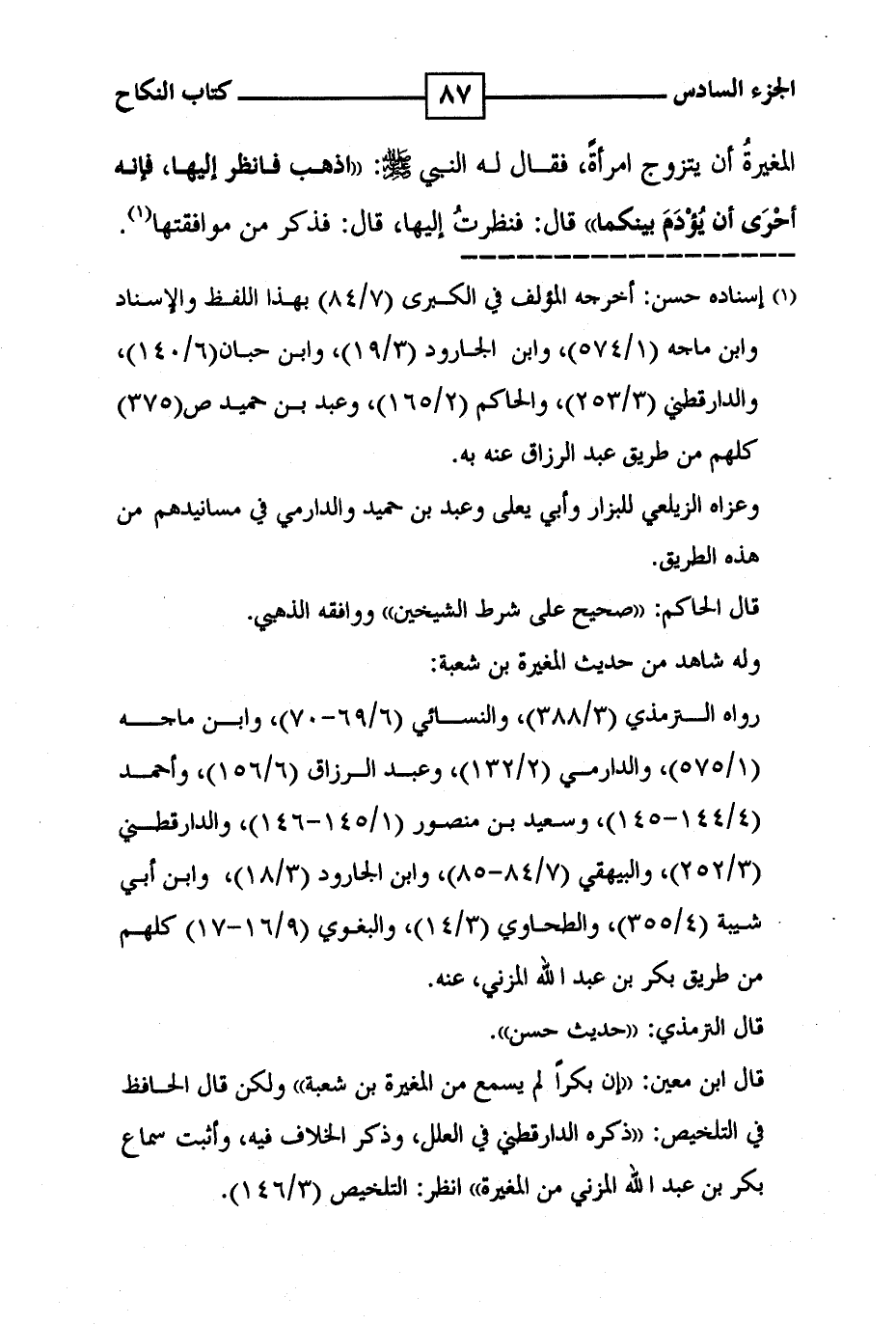 المغيرة أن يتزوج امرأة ، فقال له النبي صلى الله عليه وسلم : ' اذهب فانظر إليها ، فإنه أحرى أن يؤدم بينكما ' قال : فنظرت إليها ، قال : فذكر من موافقتها ( 1 ) .