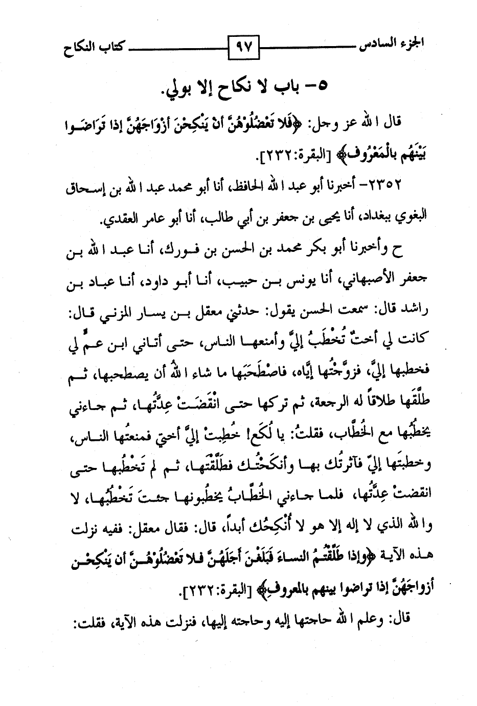 5 - باب لا نكاح إلا بولي قال الله عز وجل : ! ( فلا تعضلوهن أن ينكحن أزواجهن إذا تراضوا بينهم بالمعروف ) ! [ البقرة : 232 ] .