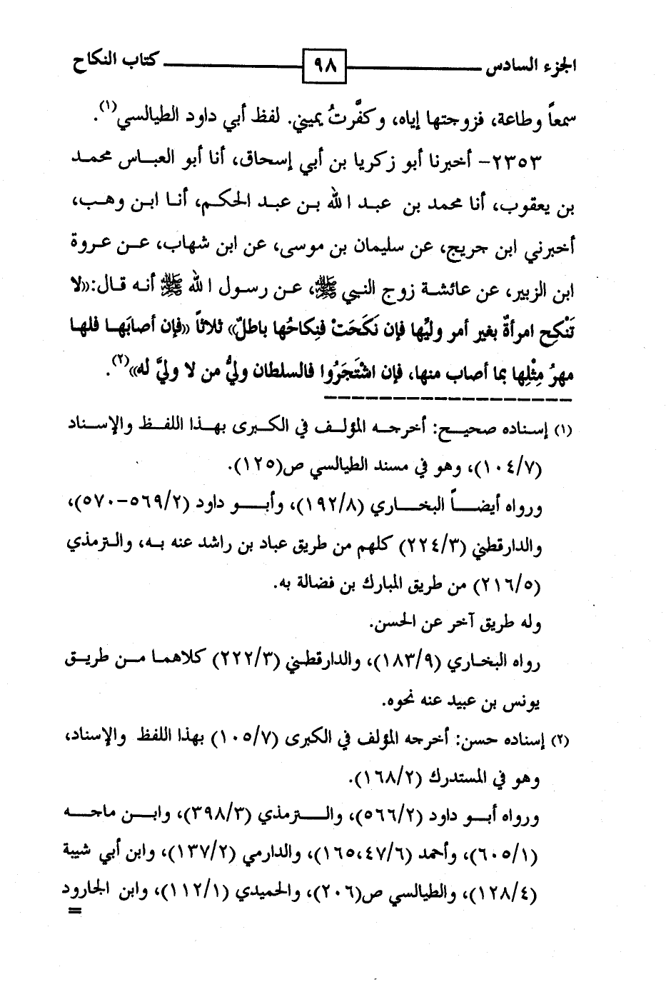 2353 - أخبرنا أبو زكريا بن أبي اسحاق ، أنا أبو العباس محمد بن يعقوب ، أنا محمد بن عبد الله بن عبد الحكم ، أنا ابن وهب ، واخبرني ابن جريج ، عن سليمان بن موسى ، عن ابن شهاب ، عن عروة ابن الزبير ، عن عائشة زوج النبي صلى الله عليه وسلم ، عن رسول الله صلى الله عليه وسلم انه قال : ' لا تنكح امرأة بغير أمر وليها فإن نكحت فنكاحها باطل ' ثلاثا ' فإن اصابها فلها مهر مثلها بما أصاب منها ، فإن اشتجروا فالسلطان ولي من لا ولي له ' ( 2 ) .