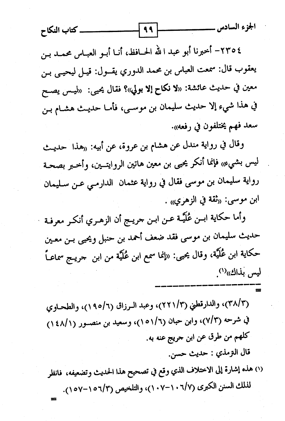 2354 - أخبرنا أبو عبد الله الحافظ ، أنا أبو العباس محمد بن يعقوب قال : سمعت العباس بن محمد الدوري يقول : قيل ليحيى بن معين في حديث عائشة : ' لا نكاح إلا بولي ' ؟ فقال يحيى : ' ليس يصح في هذا شيء إلا حديث سليمان بن موسى ، فأما حديث هشام بن سعد فهم يختلفون في رفعه ' . وقال في رواية مندل عن هشام بن عروة ، عن أبيه : ' هذا حديث ليس بشيء ' فإنما أنكر يحيى بن معين هاتين الروايتين ، وأخبر بصحة رواية سليمان بن موسى فقال في رواية عثمان الدارمي عن سليمان ابن موسى : ' ثقة في الزهري ' . وأما حكاية ابن علية عن ابن جريج أن الزهري أنكر معرفة حديث سليمان بن موسى فقد ضعف أحمد بن حنبل ويحيى بن معين حكاية ابن علية ، وقال يحيى : ' إنما سمع ابن علية من ابن جريج سماعا ليس بذاك ' ( 1 ) .