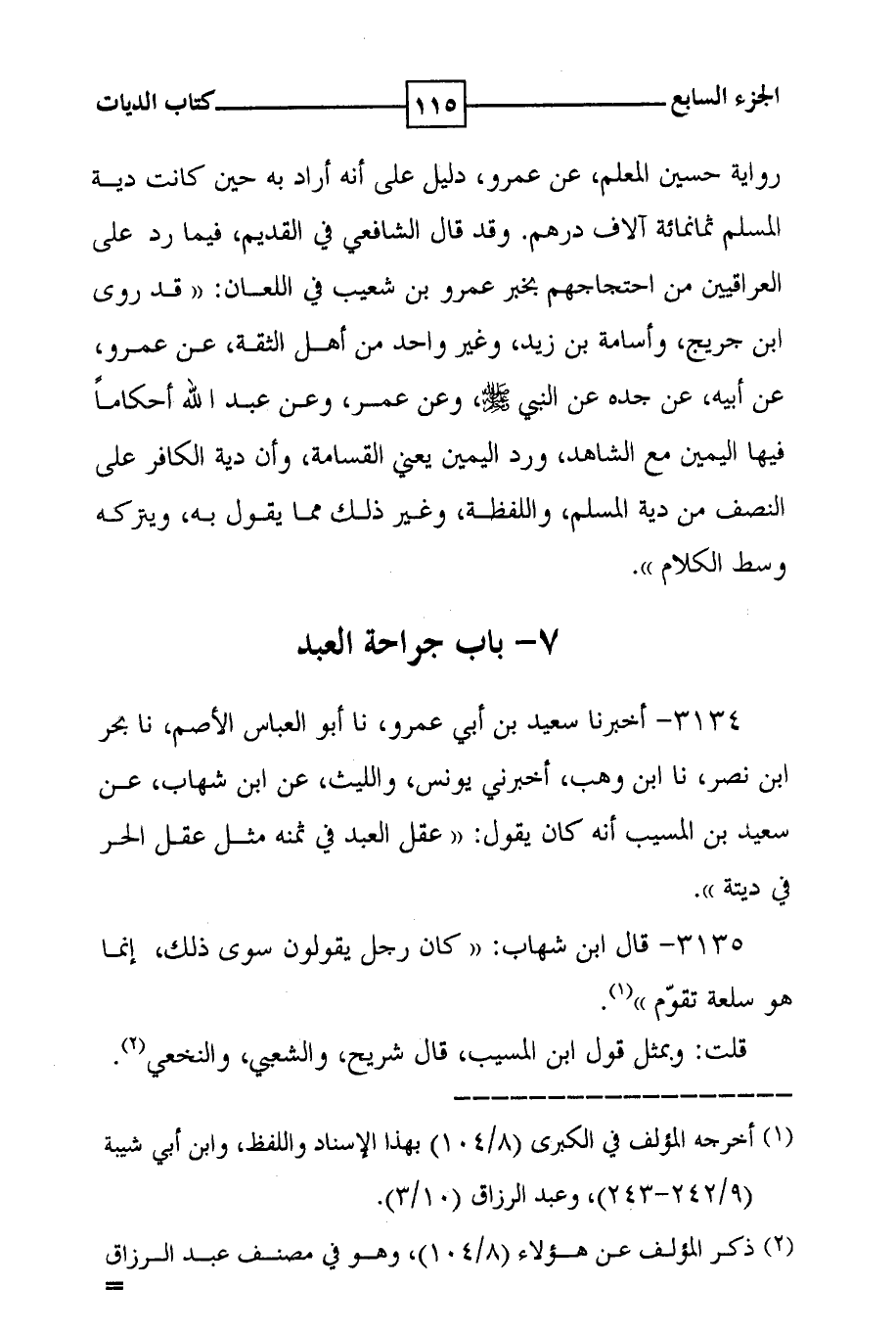 3134 - أخبرنا سعيد بن أبي عمرو ، نا أبو العباس الأصم ، نا بحر ابن نصر ، نا ابن وهب ، أخبرني يونس ، والليث ، عن ابن شهاب ، عن سعيد بن المسيب أنه كان يقول : ( ( عقل العبد في ثمنه مثل عقل الحر في ديتة ) ) .