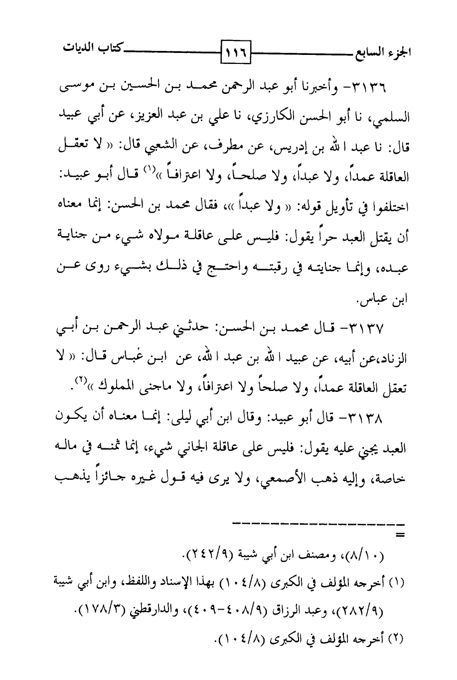 3136 - وأخبرنا أبو عبد الرحمن محمد بن الحسين بن موسى السلمي ، نا أبو الحسن الكارزي ، نا علي بن عبد العزيز ، عن أبي عبيد قال : نا عبد الله بن إدريس ، عن مطرف ، عن الشعبي قال : ( ( لا تعقل العاقلة عمداً ، ولا عبداً ، ولا صلحاً ، ولا اعترافاً ) ) ( 1 ) قال أبو عبيد : اختلفوا في تأويل قوله : ( ( ولا عبداً ) ) فقال محمد بن الحسن : إنما معناه أن يقتل العبد حراً يقول : فليس على عاقلة مولاه شيء من جناية عبده ، وإنما جنايته في رقبته واحتج في ذلك بشيء روى عن ابن عباس .