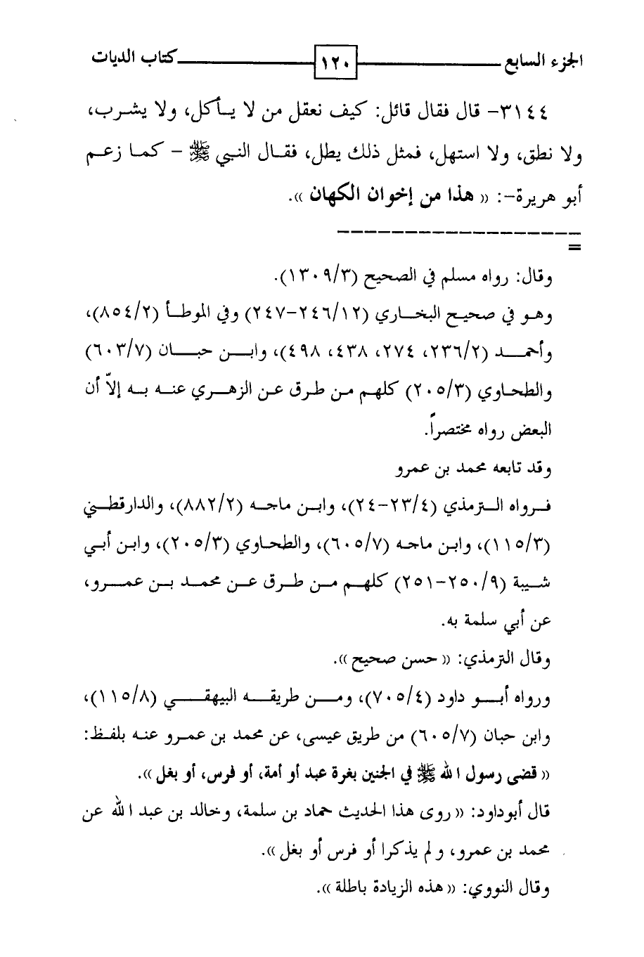 3144 - قال فقال قائل : كيف نعقل من لا يأكل ، ولا يشرب ، ولا نطق ، ولا استهل ، فمثل ذلك يطل ، فقال النبي صلى الله عليه وسلم - كما زعم أبو هريرة - : ( ( هذا من إخوان الكهان ) ) .