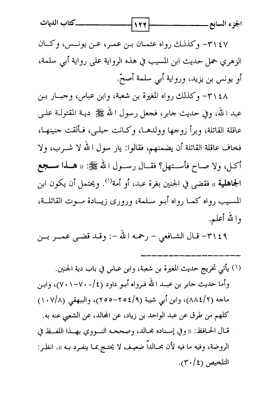 3148 - وكذلك رواه المغيرة بن شعبة ، وابن عباس ، وجبار بن عبد الله ، وفي حديث جابر ، فجعل رسول الله صلى الله عليه وسلم دية المقتول على عاقلة القاتلة ، وبرأ زوجها وولدها ، وكانت حبلى ، فألقت جنينها ، فخاف عاقلة القاتلة أن يضمنهم ، فقالوا : يا رسول الله لا شرب ، ولا أكل ، ولا صاح فأستهل ؟ فقال رسول الله صلى الله عليه وسلم : ( ( هذا سجع الجاهلية ) ) فقضى في الجنين بغرة عبد ، أو أمة ( 1 ) . ويحتمل أن يكون ابن المسيب رواه كما رواه أبو سلمة ، ورورى زيادة موت القاتلة ، والله أعلم .